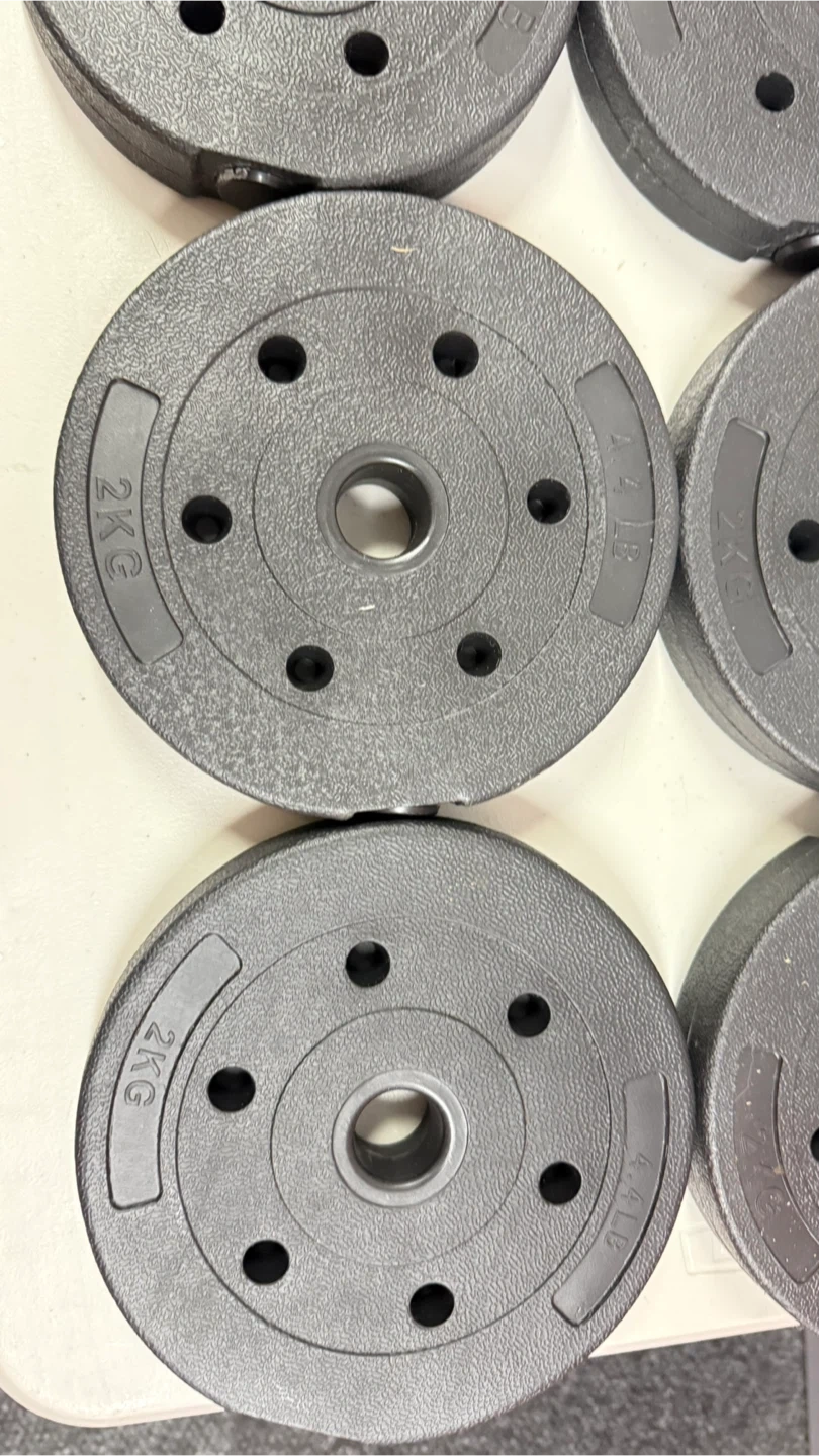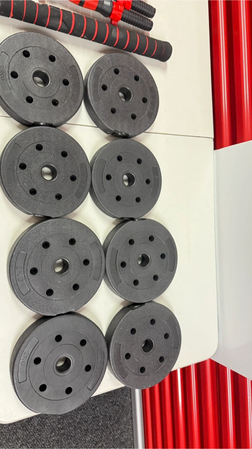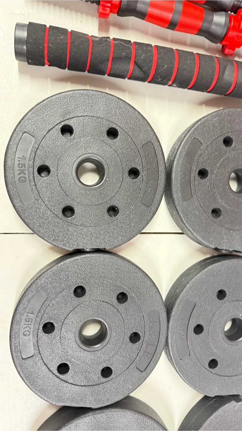 This set includes two 10lb dumbbells and multiple weight plates that can be added to the included barbell handles. The plates are labeled with weights of 1.5KG and 2KG, allowing for customizable resistance. Everything you need for a home workout is right here!