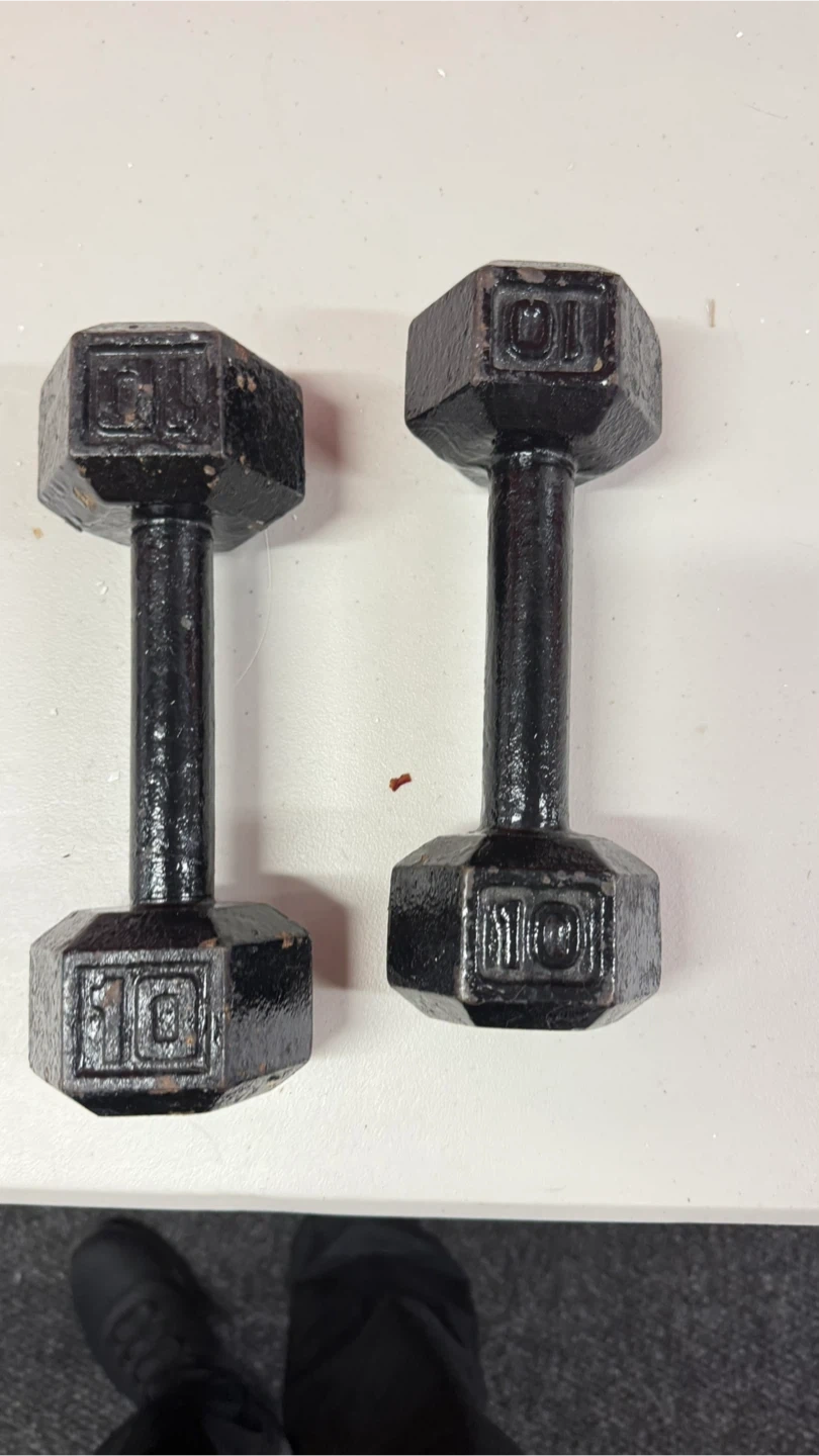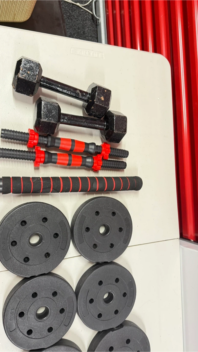 This set includes two 10lb dumbbells and multiple weight plates that can be added to the included barbell handles. The plates are labeled with weights of 1.5KG and 2KG, allowing for customizable resistance. Everything you need for a home workout is right here!