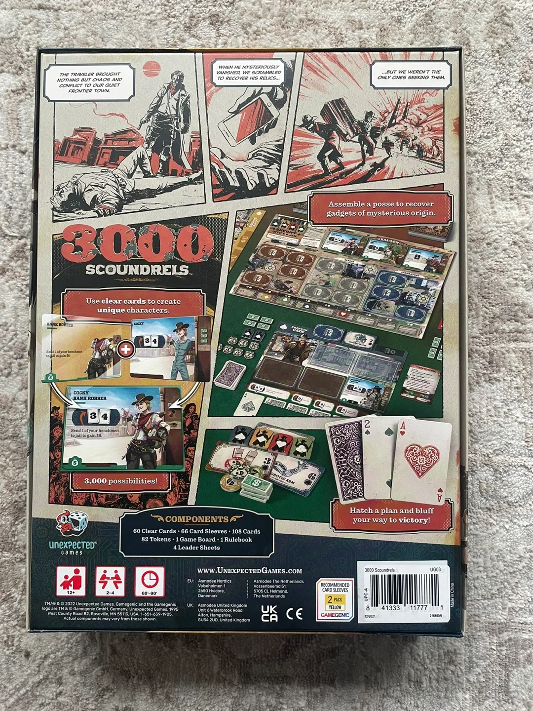 A game for 2-4 players. It includes 60 Clear Cards, 66 Card Sleeves, 108 Cards, 82 Tokens, 1 Game Board, and 4 Leader Sheets. Assemble a posse to recover gadgets of mysterious origin!
