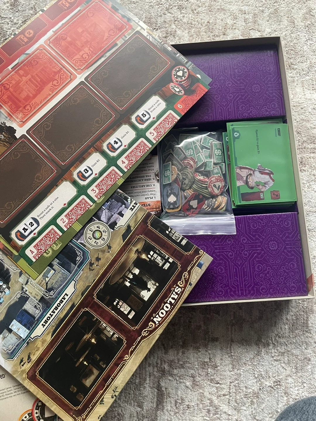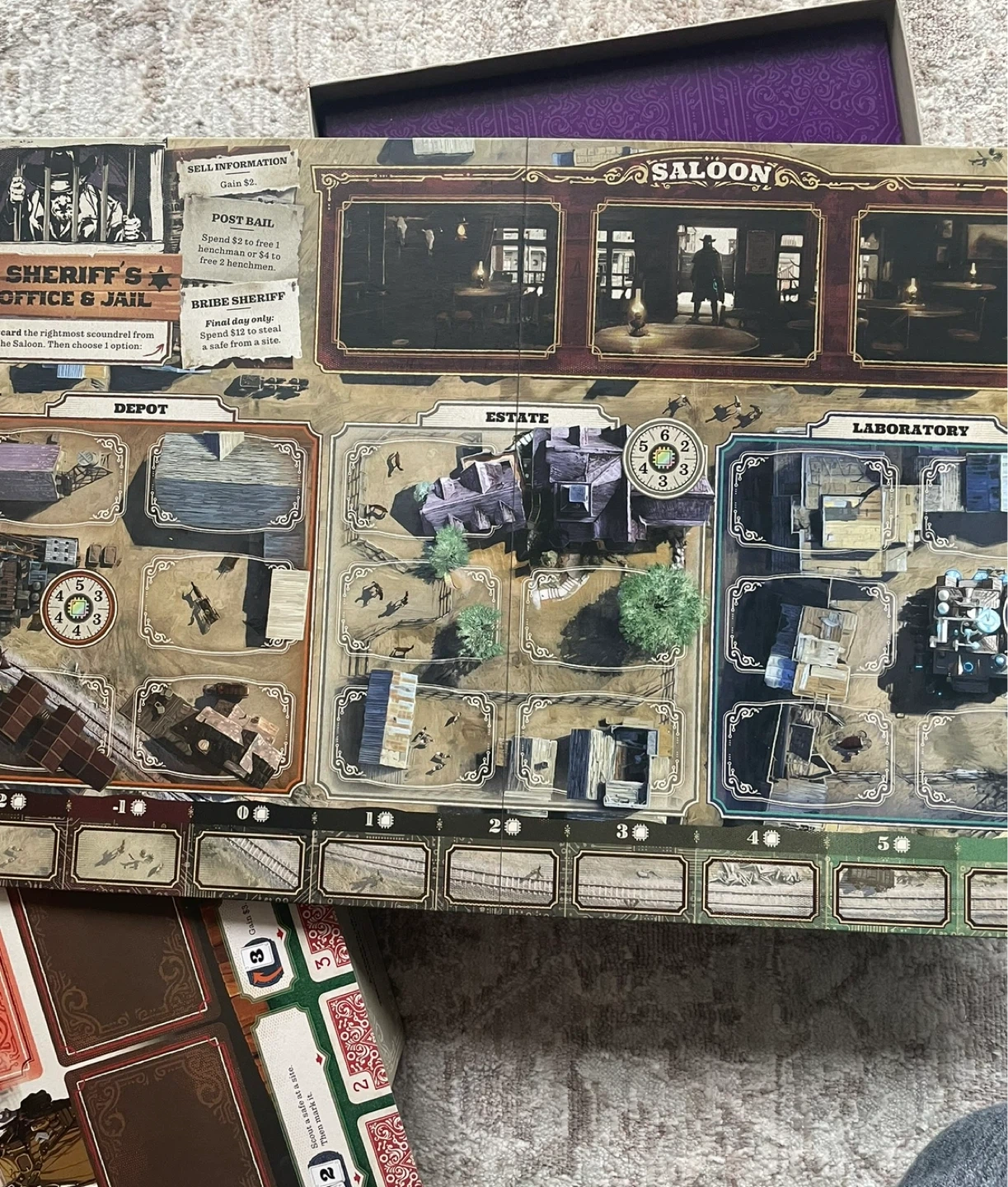 A game for 2-4 players. It includes 60 Clear Cards, 66 Card Sleeves, 108 Cards, 82 Tokens, 1 Game Board, and 4 Leader Sheets. Assemble a posse to recover gadgets of mysterious origin!