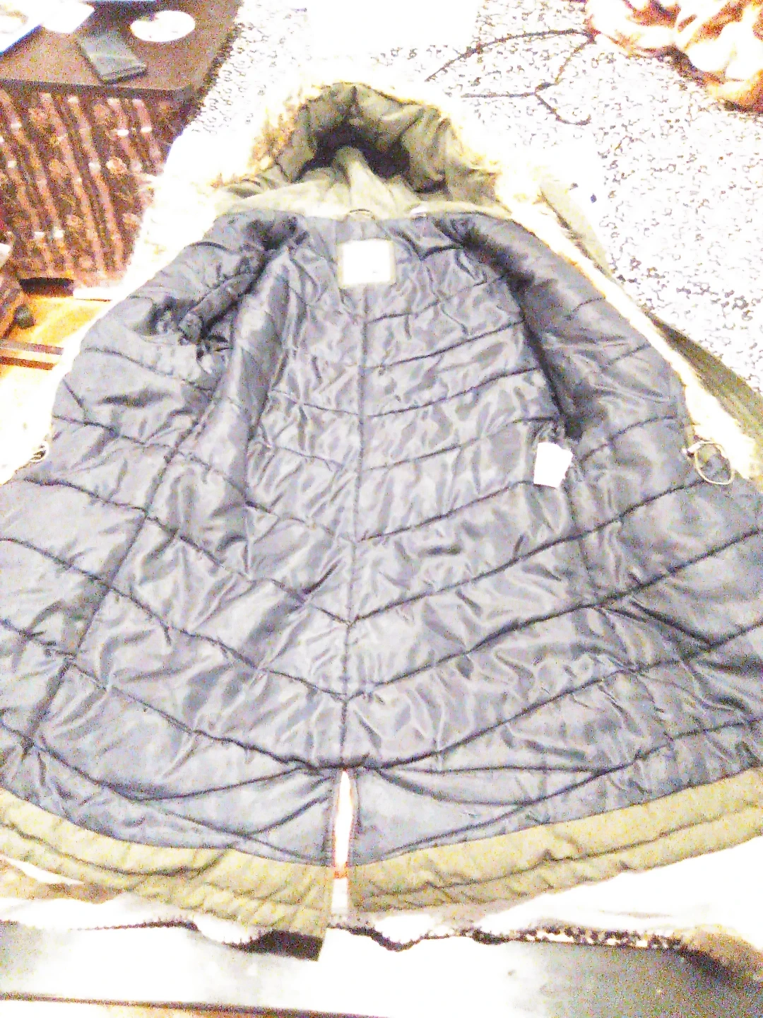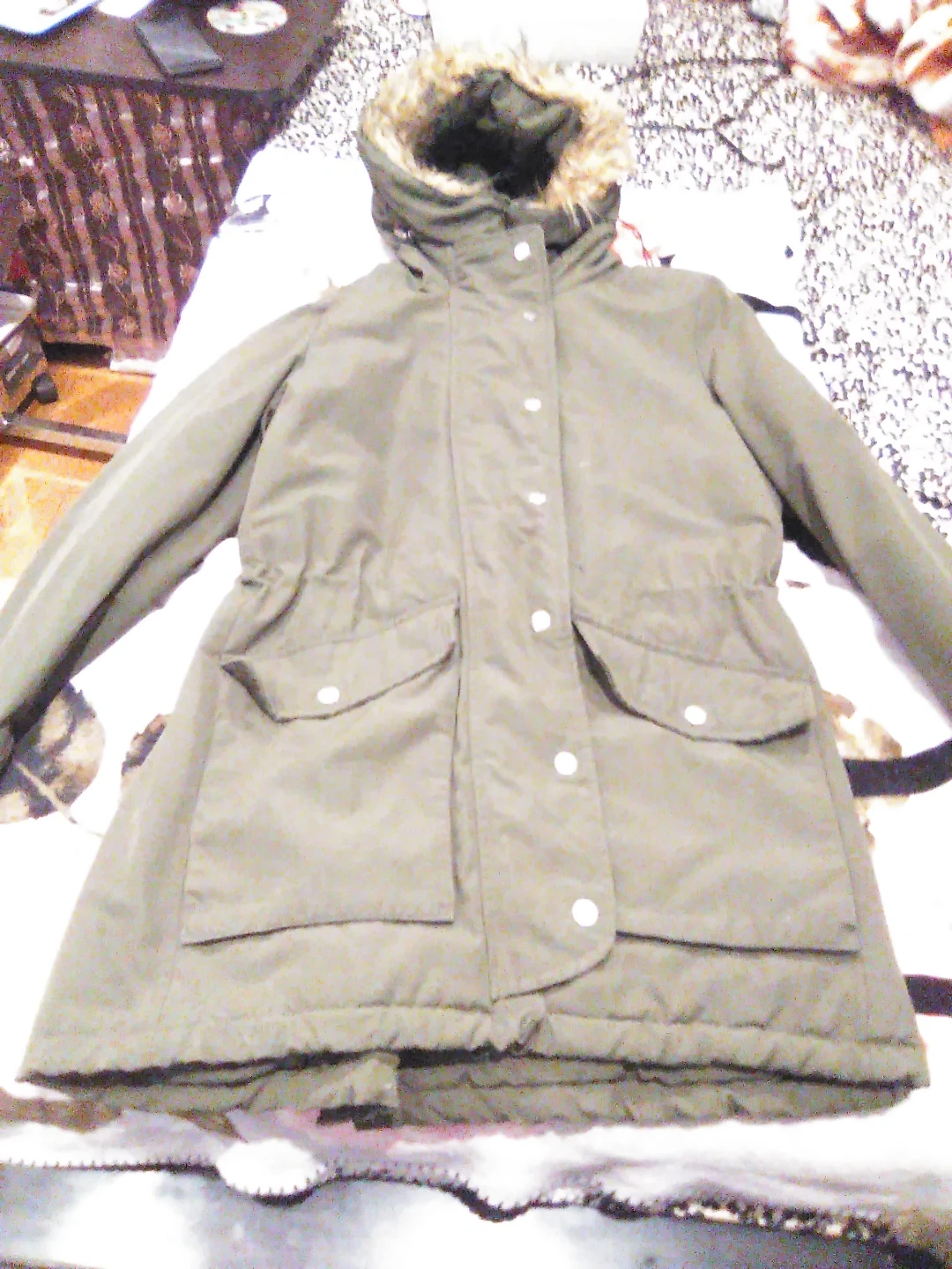 Selling a Levi's parka in olive green! It's a size S and has a faux fur-lined hood. Perfect for staying warm and stylish during the colder months