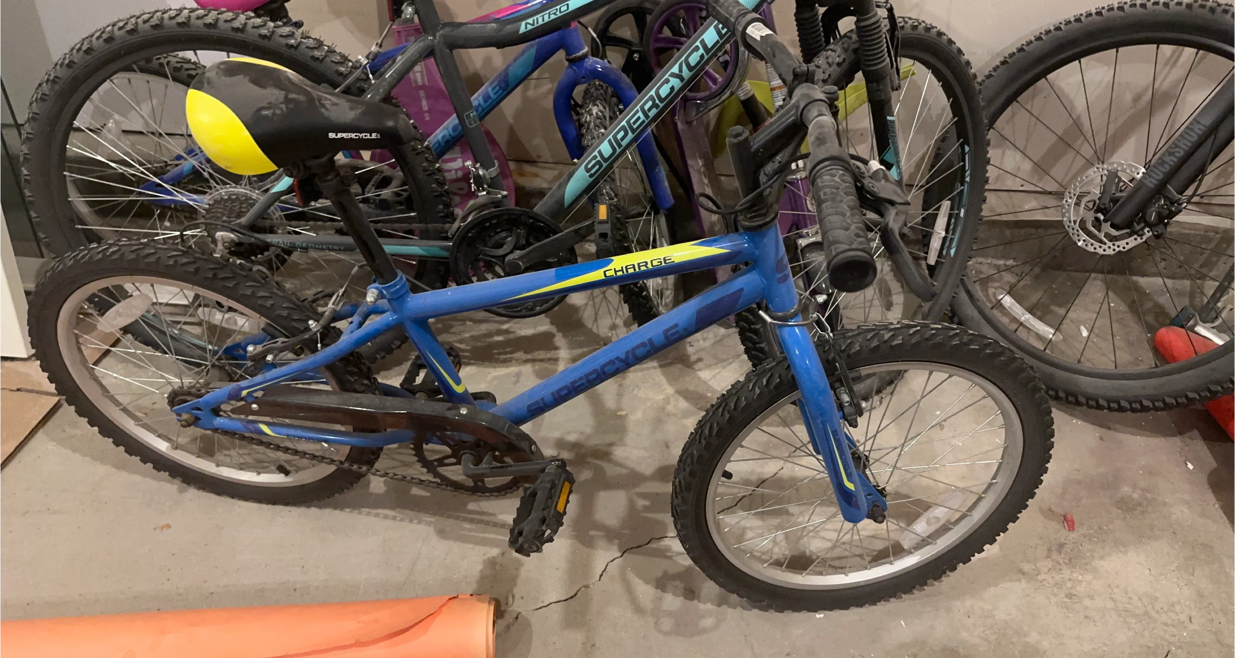 This is a Supercycle Charge kids bike. It's blue with yellow accents and has 20-inch wheels. This bike is great for getting around town or on trails.