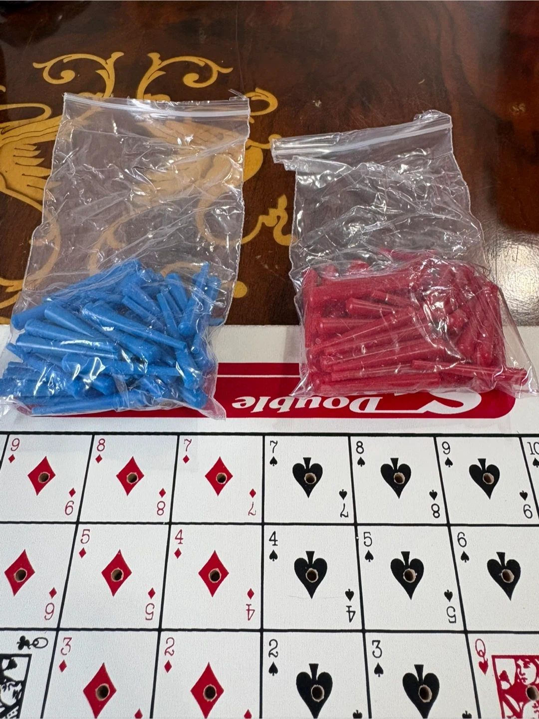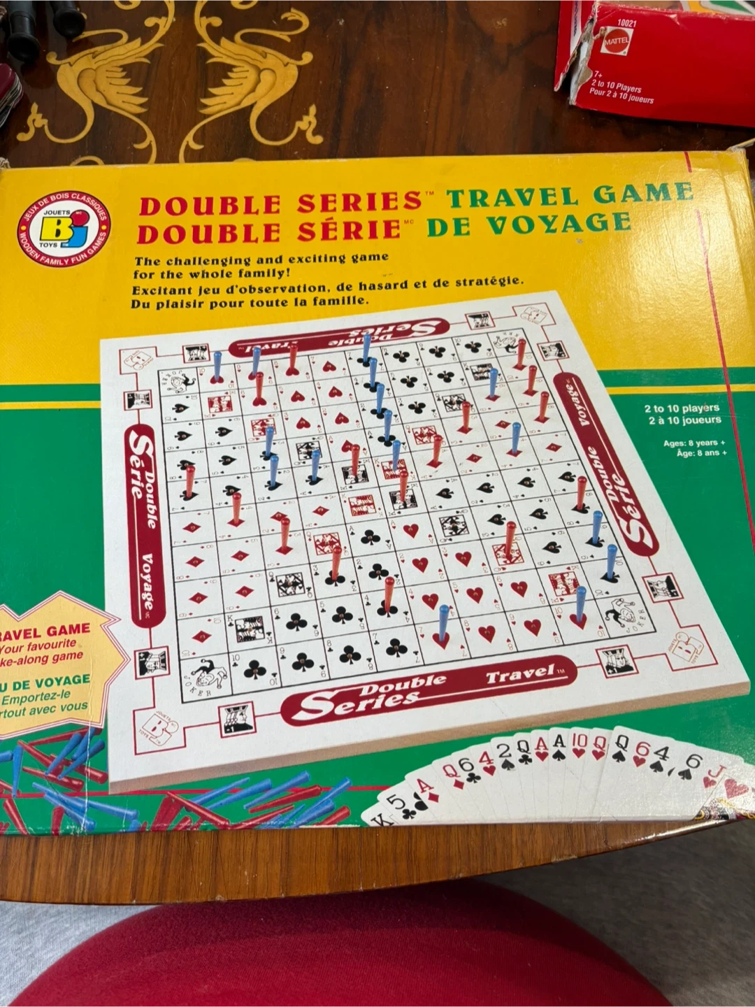 This is the Double Series Travel Game from Bota-Jeu. It includes 1 wooden travel board, 50 blue pegs, and 50 red pegs. This game is for 2 to 10 players. The board dimensions are 30 cm x 30 cm.