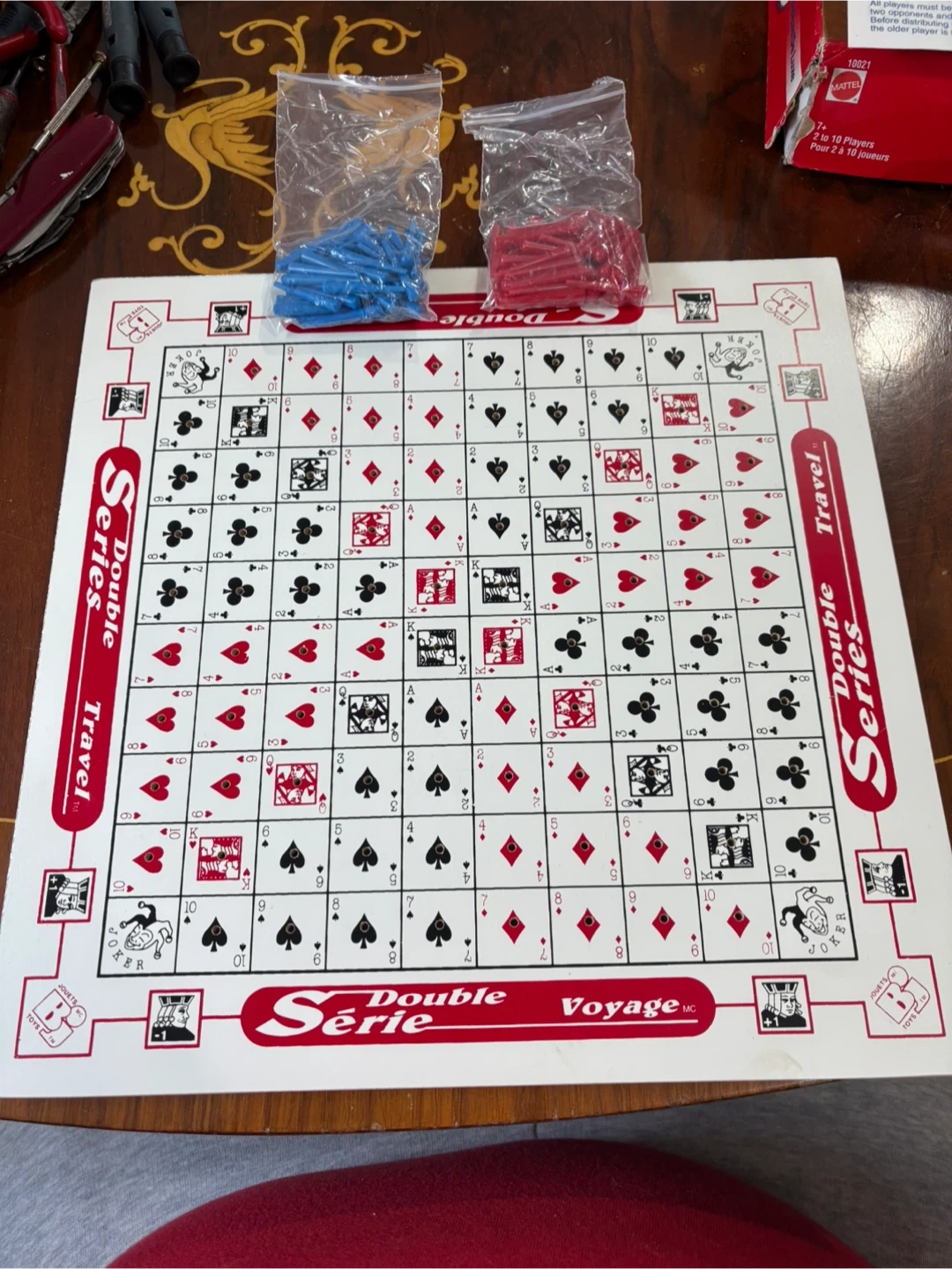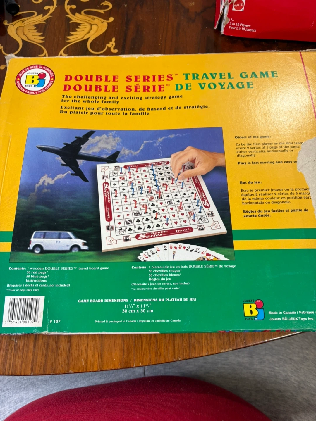 This is the Double Series Travel Game from Bota-Jeu. It includes 1 wooden travel board, 50 blue pegs, and 50 red pegs. This game is for 2 to 10 players. The board dimensions are 30 cm x 30 cm.