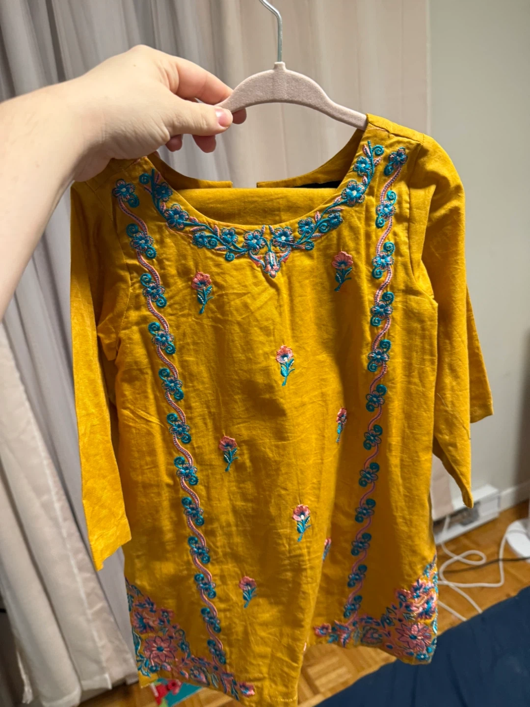Selling a lovely yellow kurti with intricate blue and pink embroidery. It features a comfortable round neckline and three-quarter sleeves. Perfect for casual wear or festive occasions!