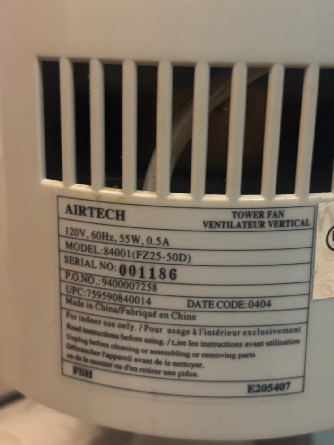 Airtech Tower Fan 120V, 60Hz, 55W