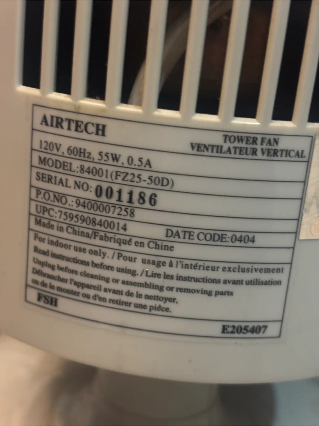 Airtech Tower Fan 120V, 60Hz, 55W