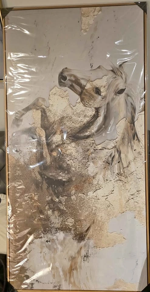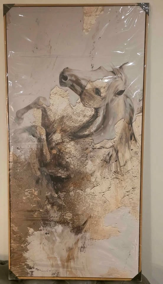 Brand new, never used, still in protective wrapping. Solid wood frame, ready to hang. This piece features soft neutral beige, taupe, and grey tones with minimal gold accents. Actual item shown in photos. Size: 120 × 60 cm (Large vertical canvas). Similar designs are listed on Amazon at higher prices for smaller sizes. This is the larger size being sold at a great price for quick pickup. Pickup: Mississauga near Winston Churchill & Britannia.