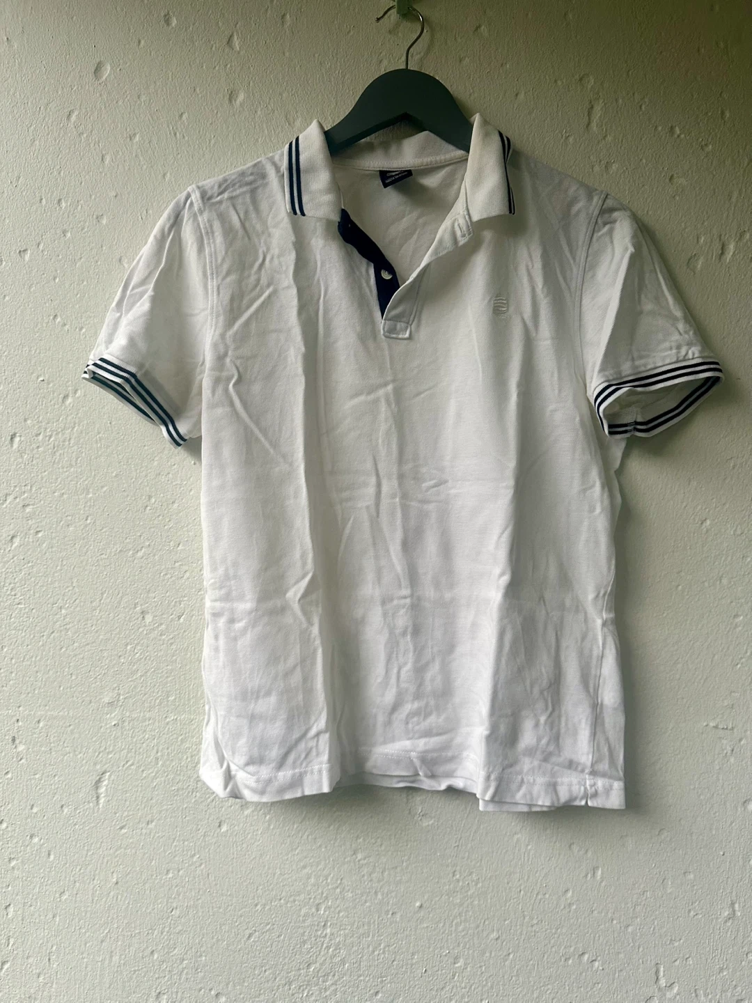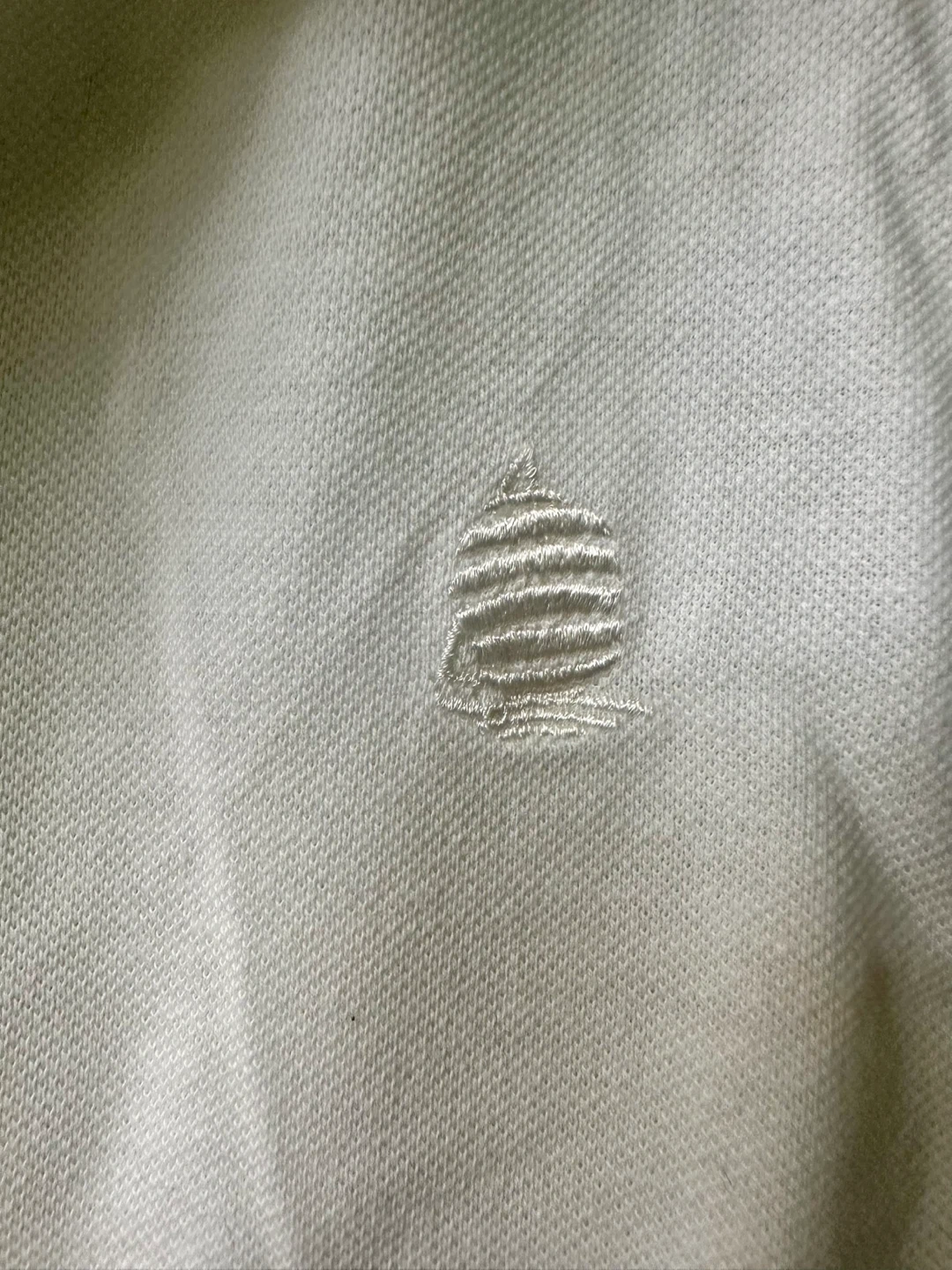 A white short-sleeved polo shirt by Marina Yachting. It features a collared neckline with button closure and striped trim on the cuffs. There's a small embroidered logo on the front.