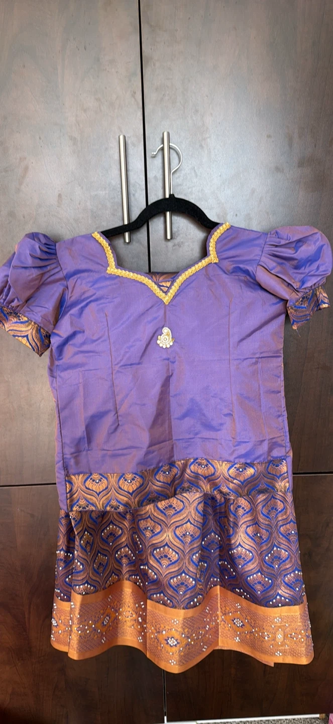 Beautiful purple silk blend skirt and blouse set with gold and blue intricate pattern. Embellished with decorative stones along the borders and neckline.