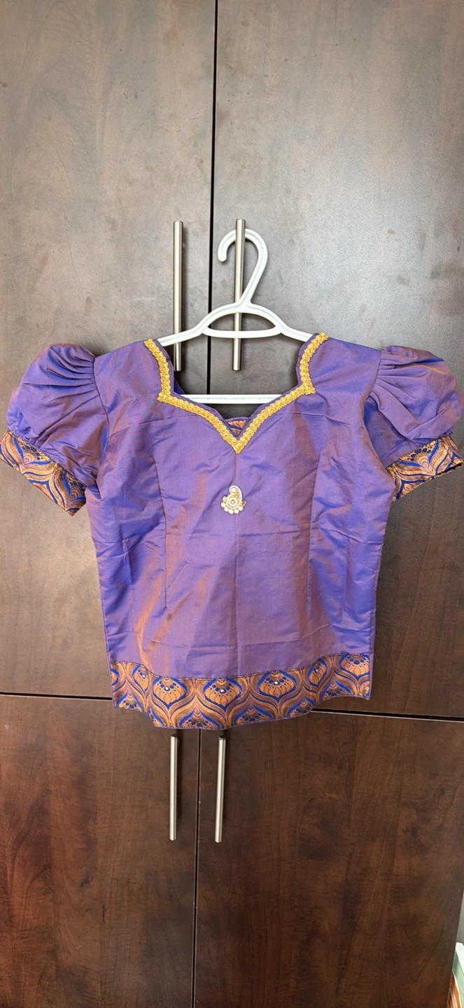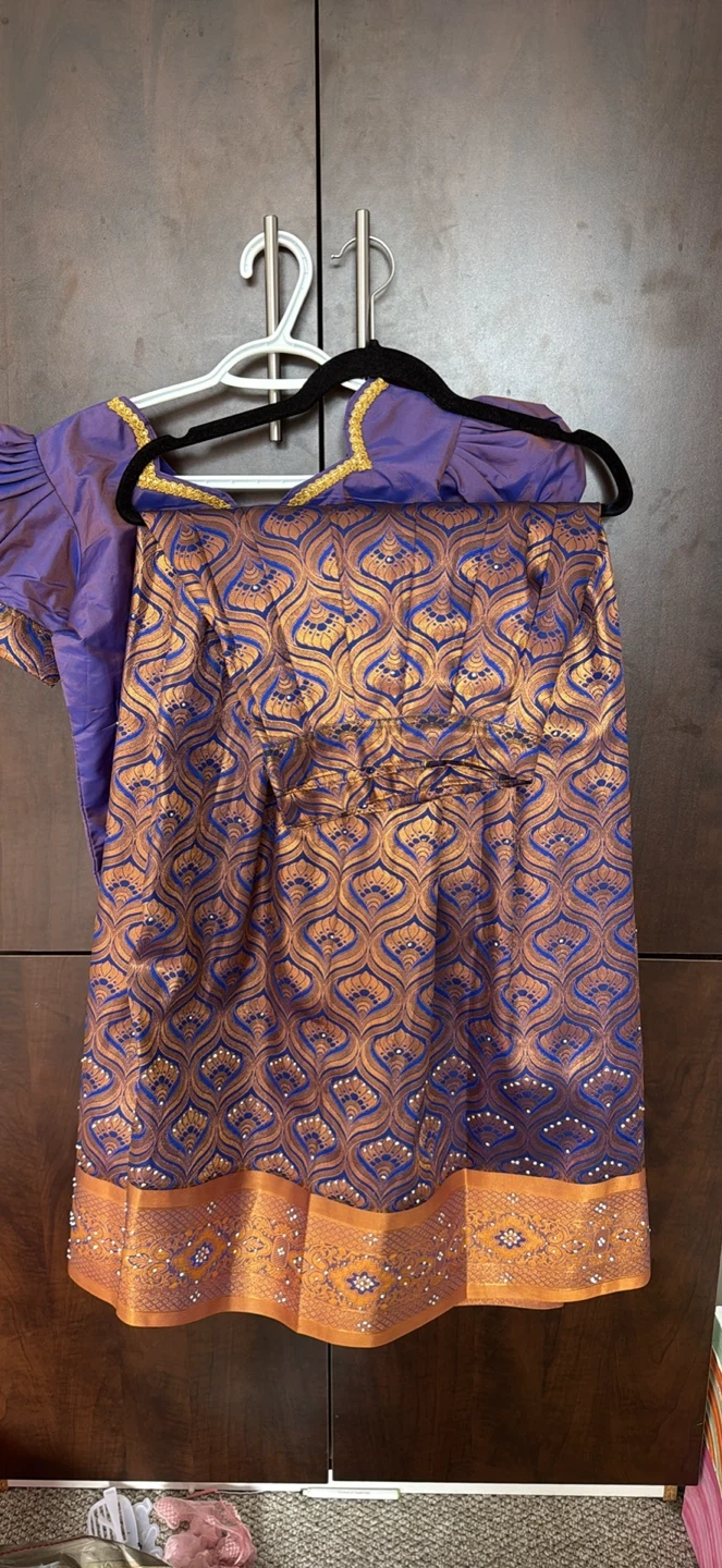 Beautiful purple silk blend skirt and blouse set with gold and blue intricate pattern. Embellished with decorative stones along the borders and neckline.