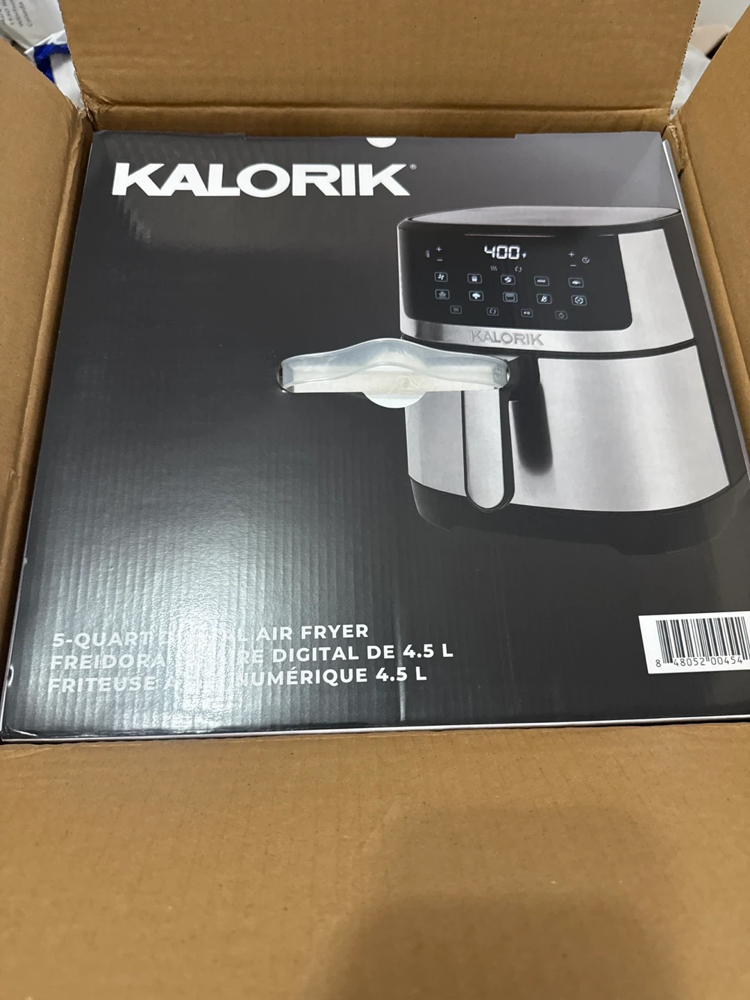 This is a Kalorik 5-quart digital air fryer. It has a 4.5 L capacity. Its digital display makes it easy to use.