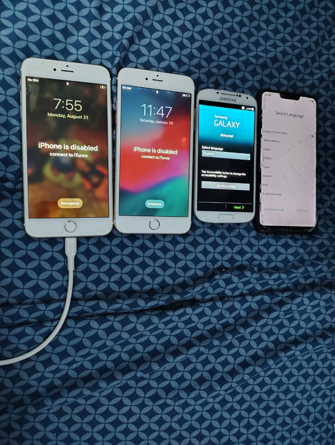 Selling a lot of 4 mobile phones. 2Apple iPhone 6S, 1 oppo 3E, 1 Samsung Galaxy S4 phones in different colors. Both iPhones are locked. Oppo and Samsung phones are unlocked. Good for collectors of old phones or spare parts.