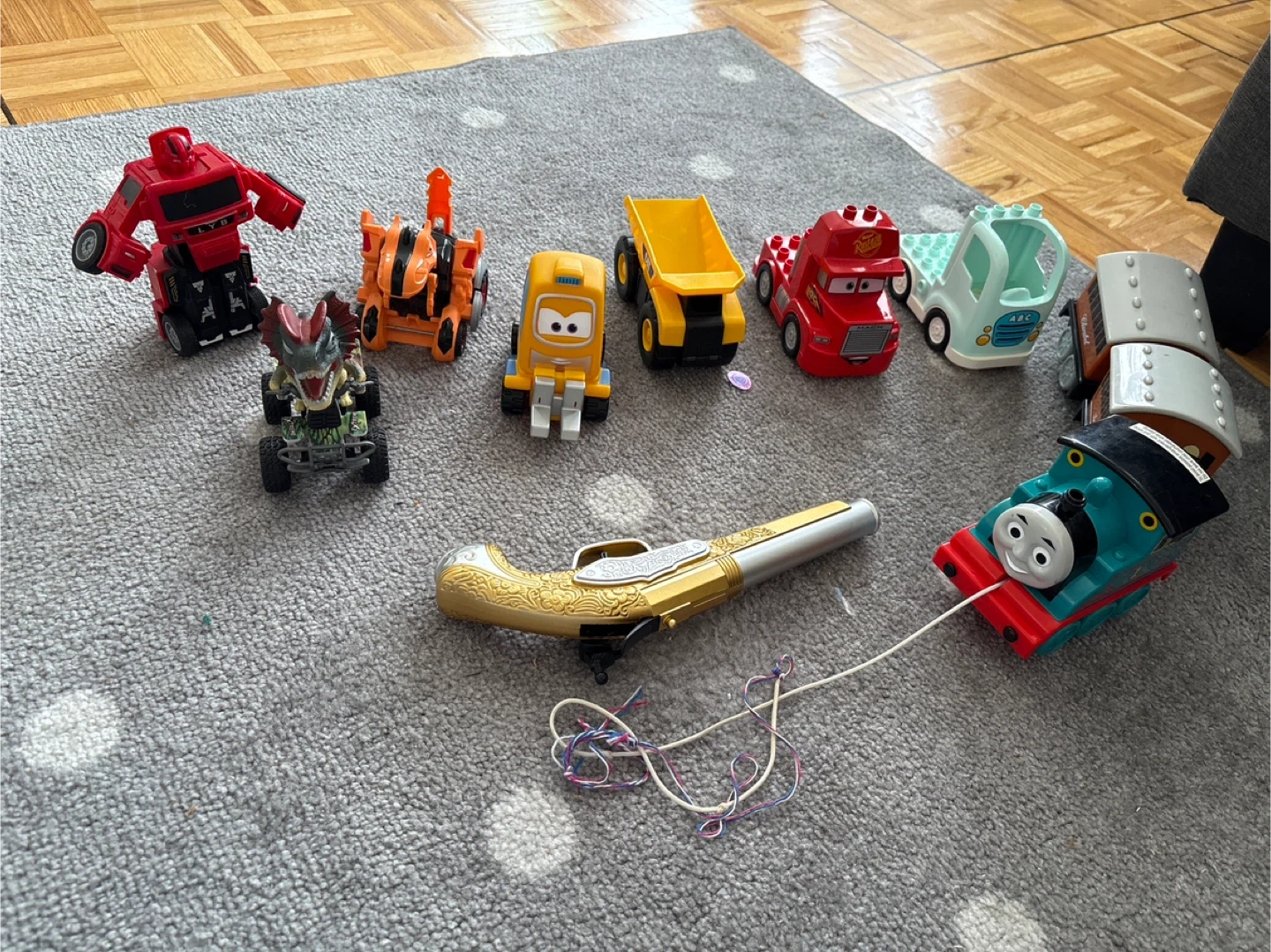 Collection of toy vehicles including a red robot, orange transformer, green dinosaur, yellow car, yellow dump truck, red Lightning McQueen, and a light blue truck with ABCs. Also includes a gold antique-style pistol and Thomas the Tank Engine. These toys are great for imaginative play!