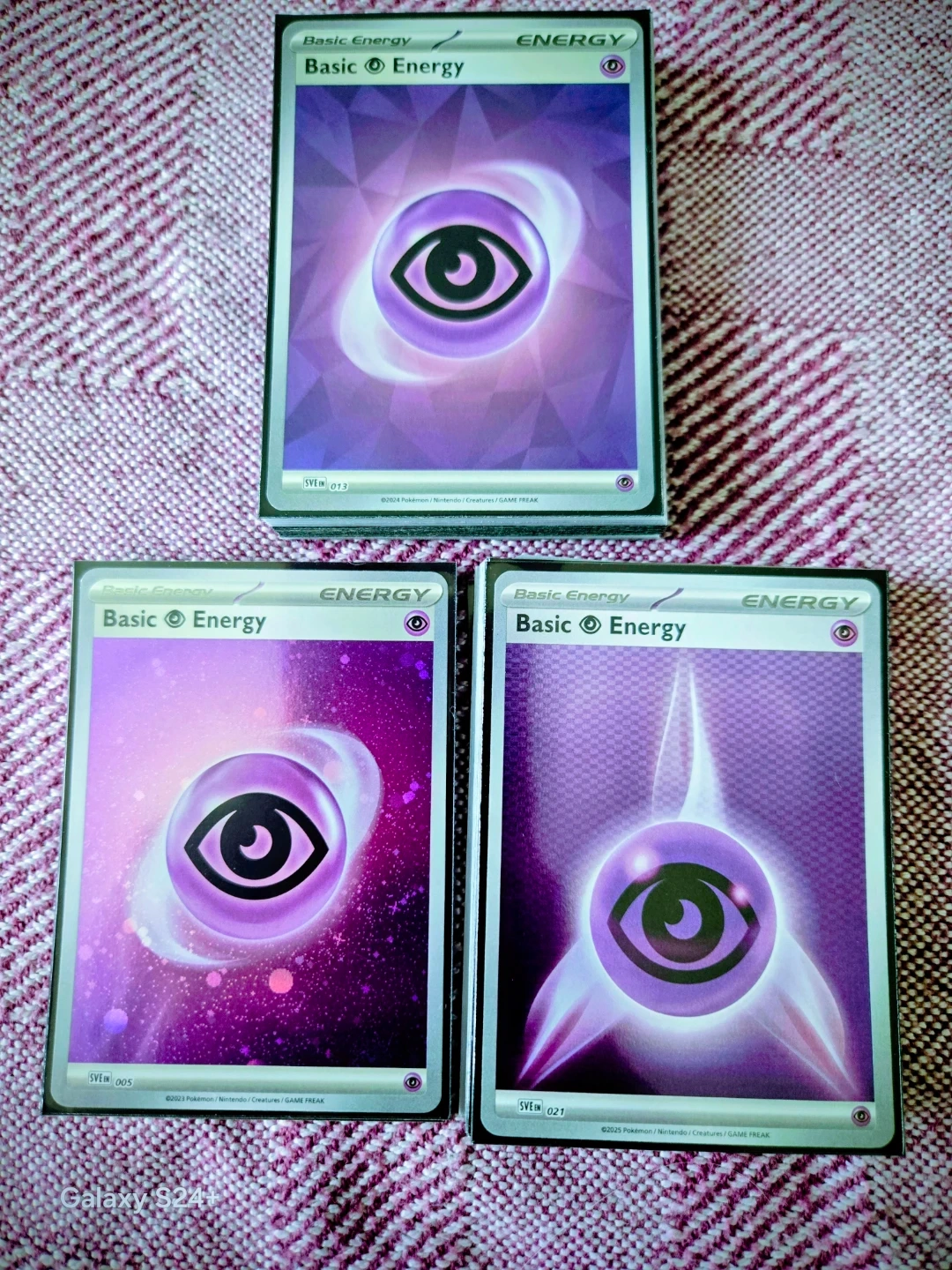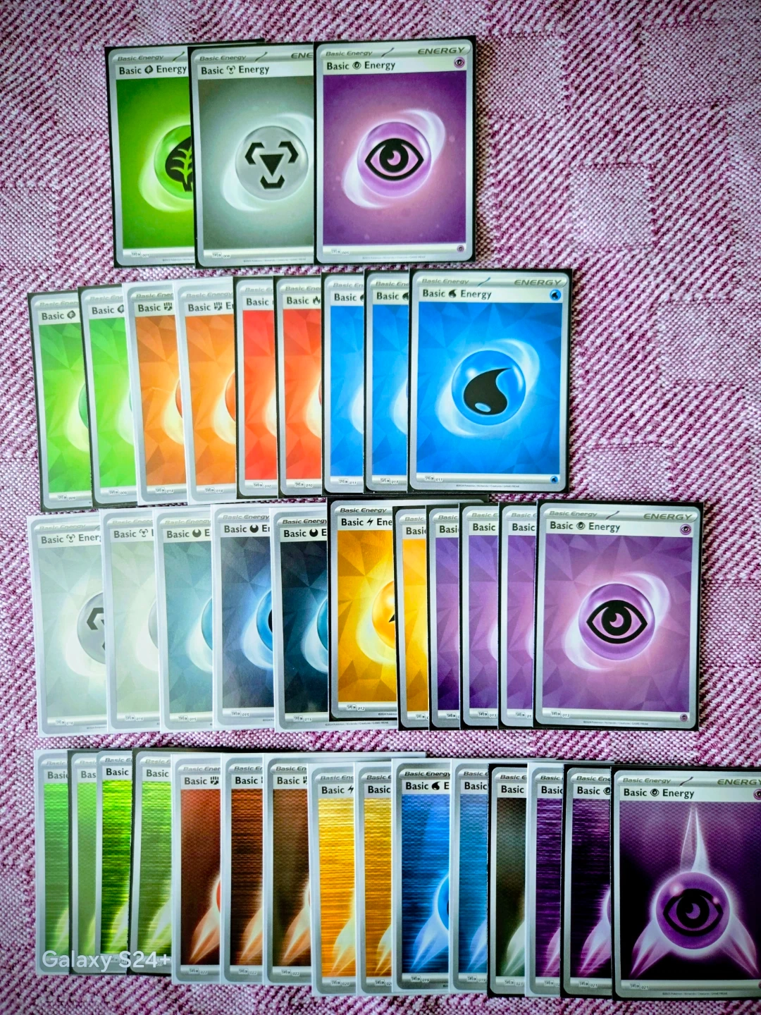 Collection of basic energy cards for the Pokémon Trading Card Game. Includes various types like Grass, Fire, Water, and Psychic. Perfect for building your Pokémon deck or completing your collection!