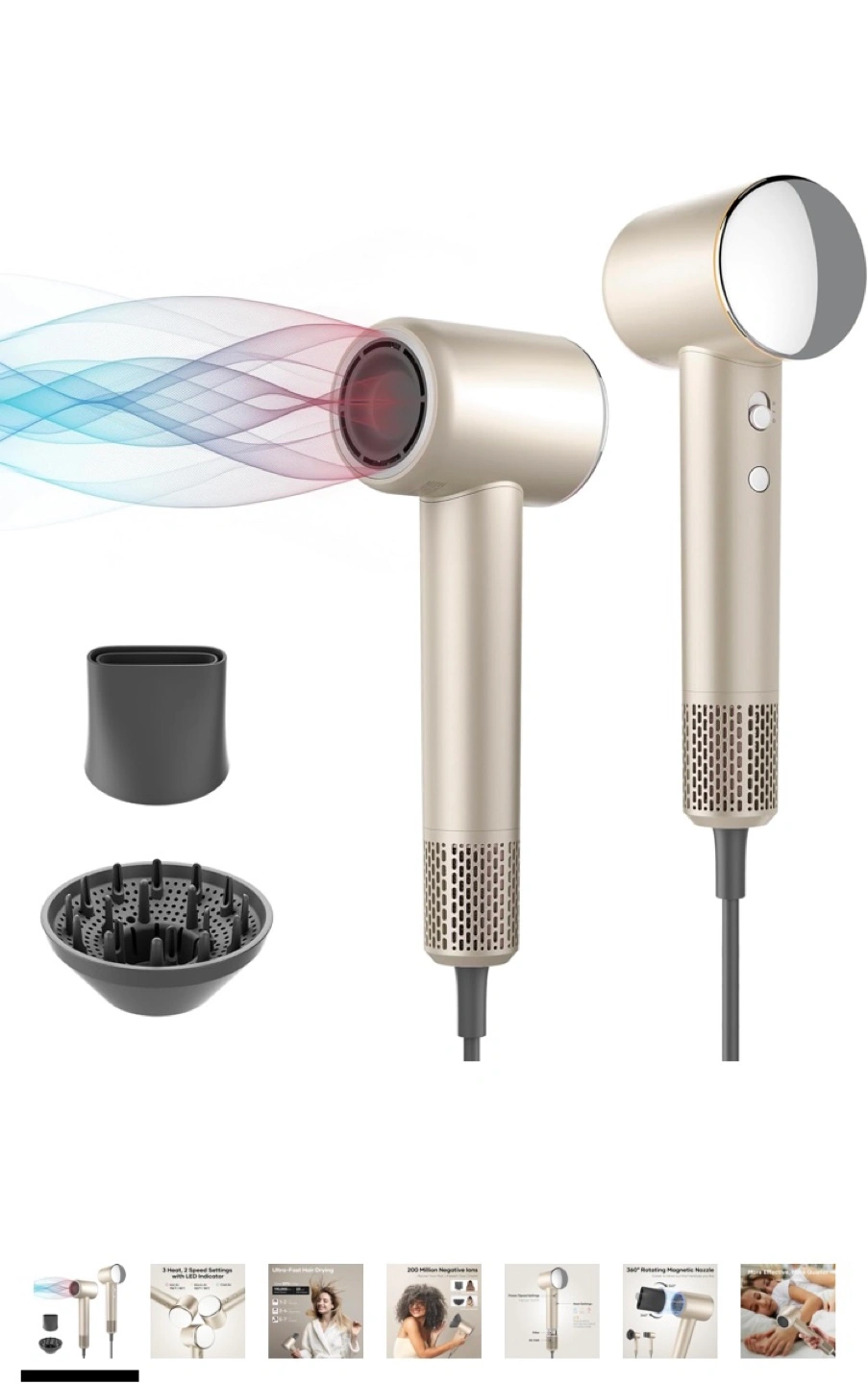 Brand new, never used. Includes hair dryer, concentrator nozzle, and diffuser attachment. Champagne gold colour. High-speed drying.