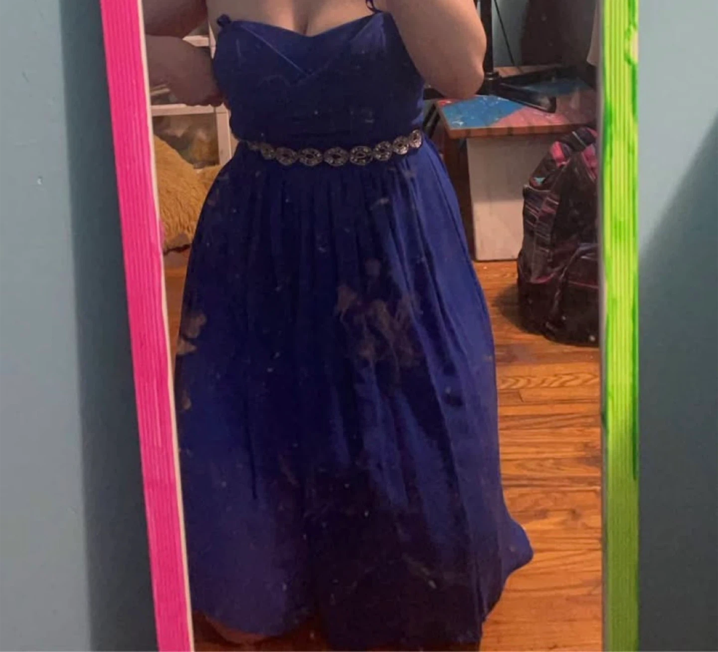 This royal blue prom dress features a strapless bodice and an embellished sequined belt. It's a floor-length gown with spaghetti straps. A lovely choice for formal events!