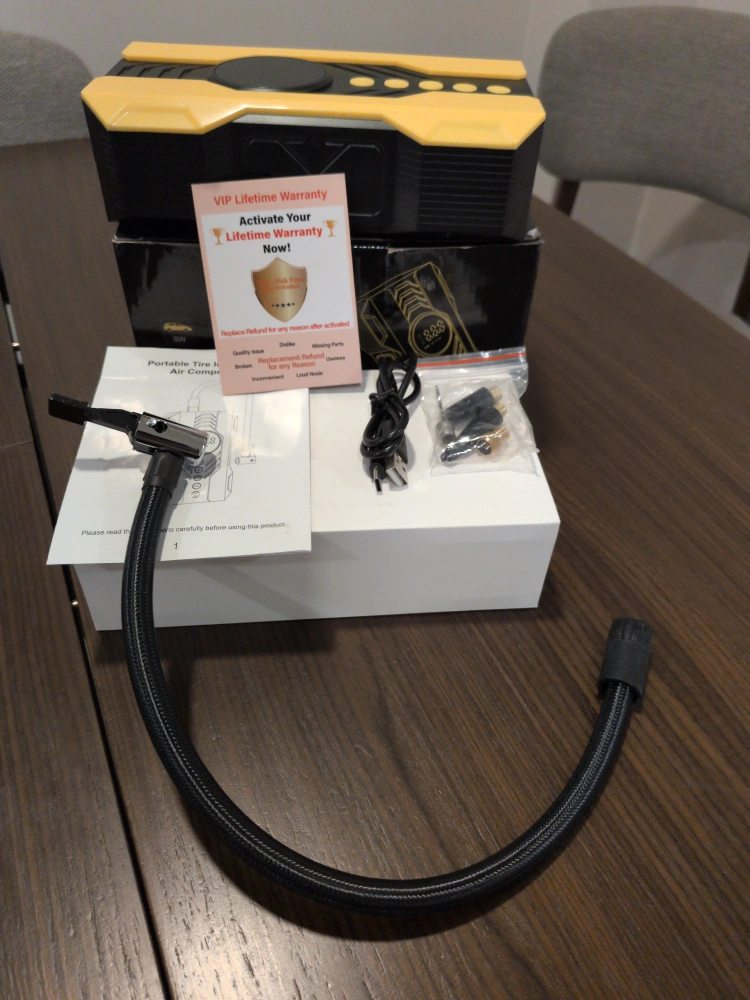 Selling a portable tire inflator and air pump by Kalyoosen! It's perfect for inflating tires on cars, trucks, motorcycles, and bicycles. This handy device is designed to be used anywhere and is worry-free. It comes with the box and all the included components.