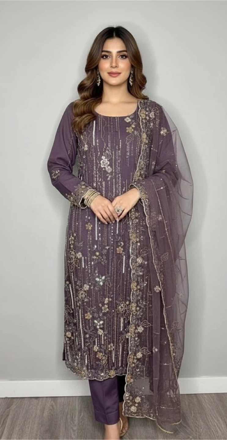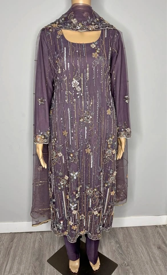 Real Turkish cutdana Pakistani net dress. No pasting, all work with thread. Almost 3 meter dupatta. Shirt length: 48 inches, Shirt chest: 22.5 inches. Trouser length: 38 inches. Purple Mauve color.