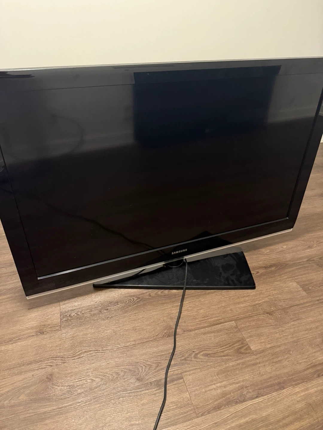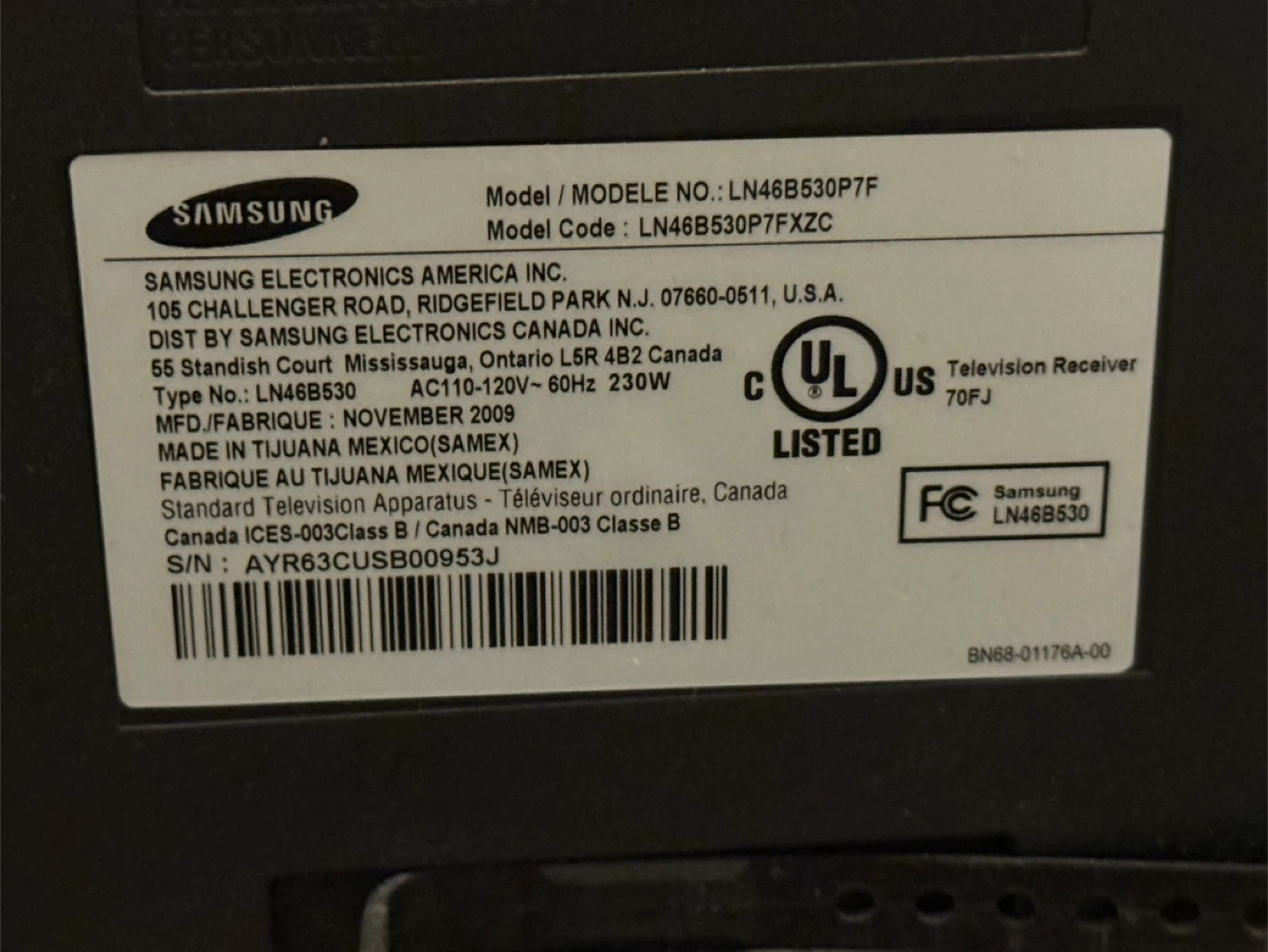 Samsung 46-inch LCD HDTV, model LN46B530P7F. Manufactured in November 2009. AC 110-120V~60Hz 230W. This television receiver is a standard television apparatus. It's a good option for a secondary TV or a basement setup.