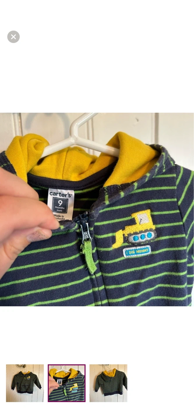 Carters brand. Zip up hoodie. Green striped construction vehicle print. Size 9m. Brand new condition $5