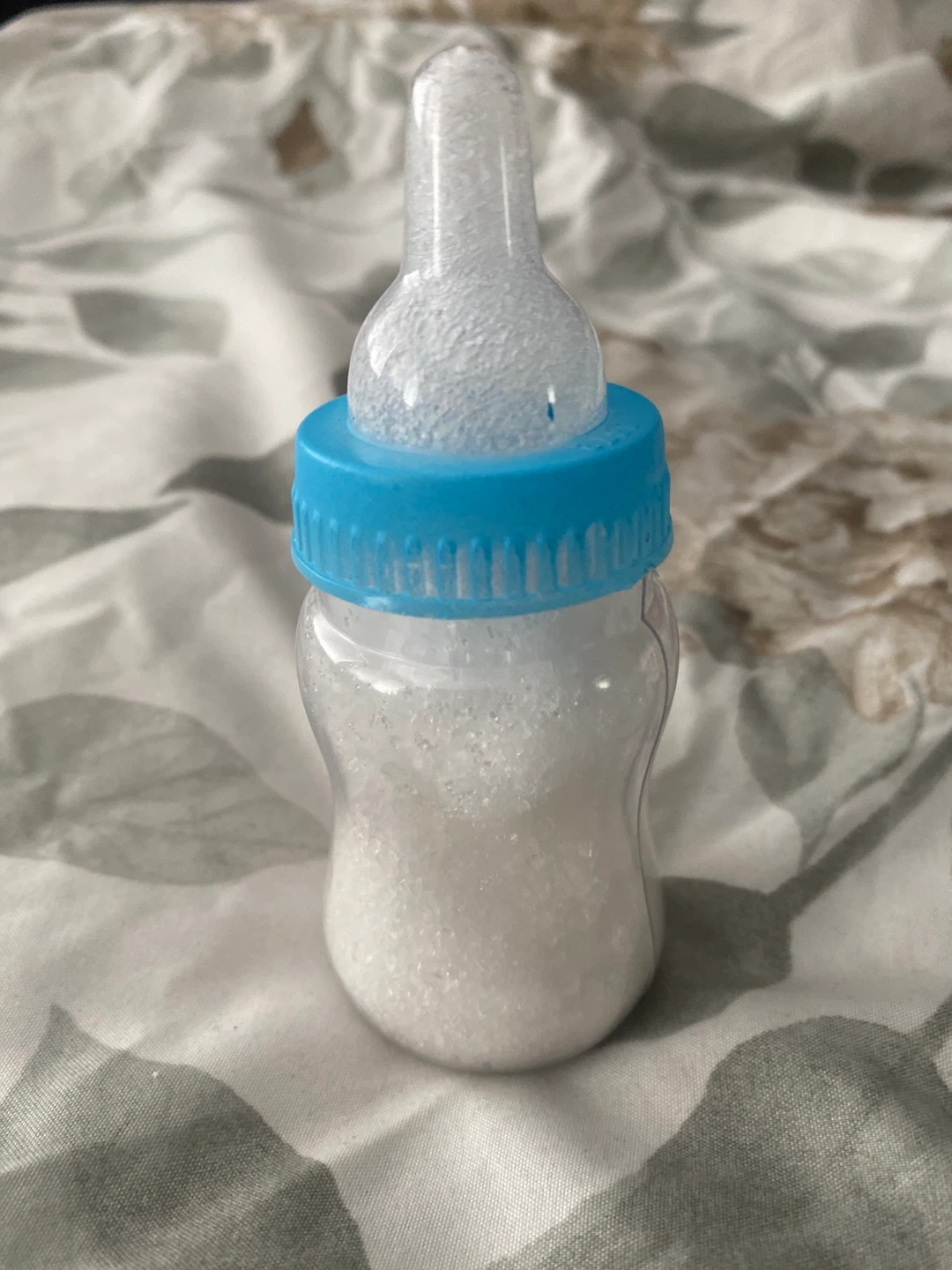 Clear baby bottle with a blue ring and nipple. It's filled with white granules. This bottle could be used as a prop or for craft projects. Plastic material. NOT FIT FOR CONSUMPTION