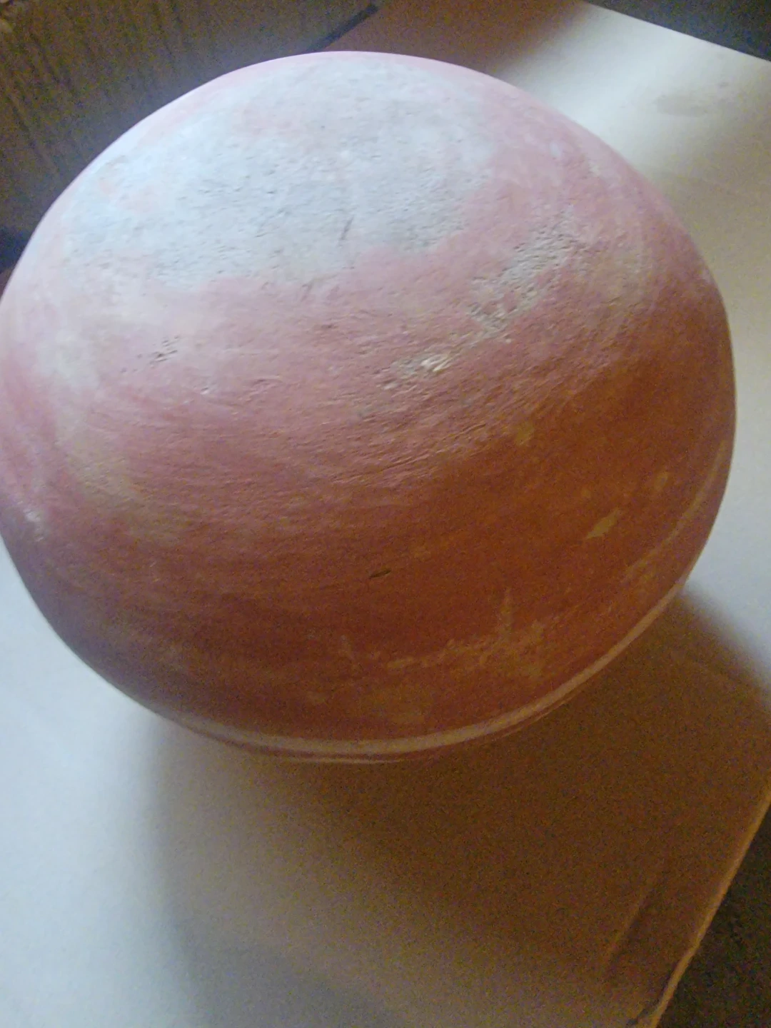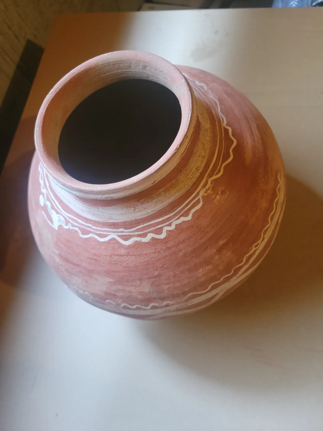 Traditional earthern water pot with white decorative markings. This pot is made from clay. It's great for decoration as its broken so can'thold water.