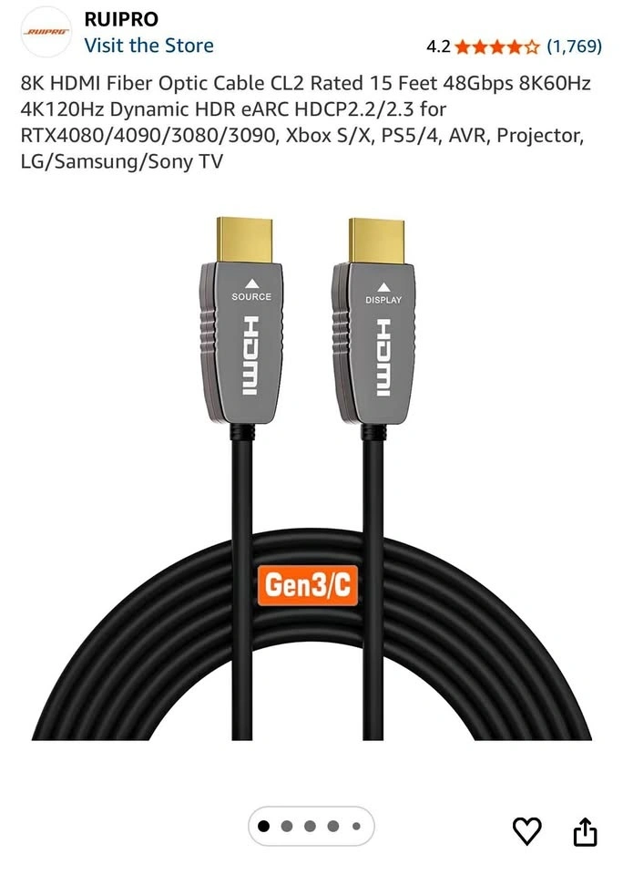 8K HDMI Fiber Optic Cable CL2 Rated 15 Feet. Supports 48Gbps, 8K60Hz, 4K120Hz, Dynamic HDR, eARC, HDCP2.2/2.3. Great for RTX4080/4090/3080/3090, Xbox S/X, PS5/4, AVR, Projector, and LG/Samsung/Sony TVs. Let me know if you're interested!