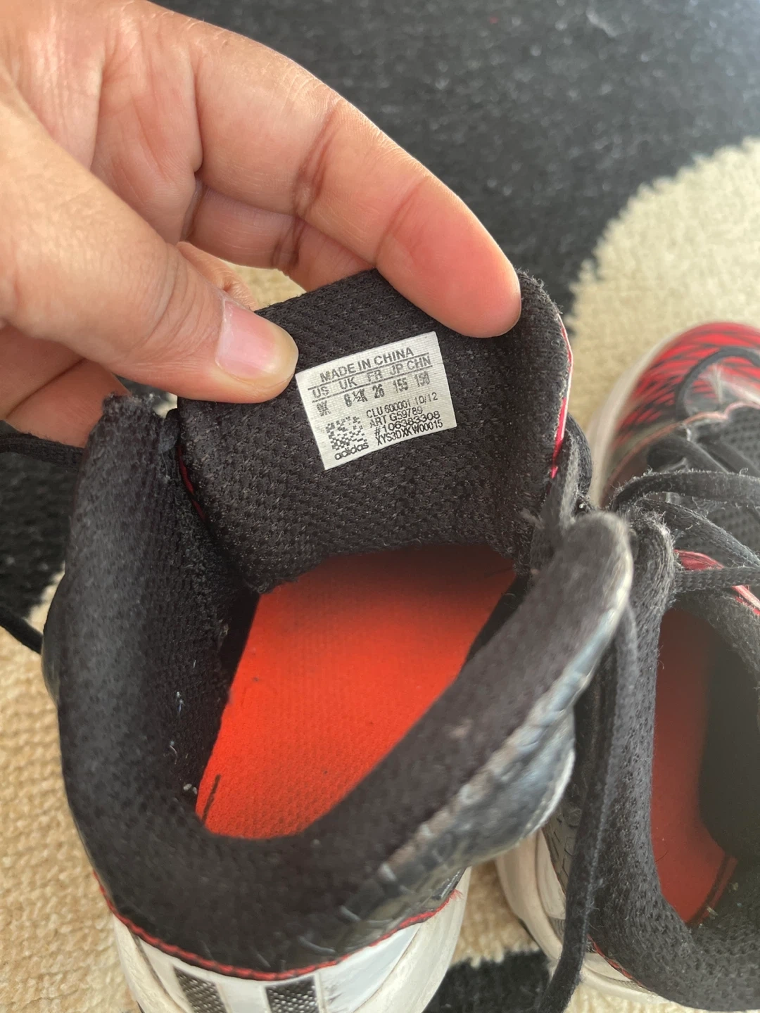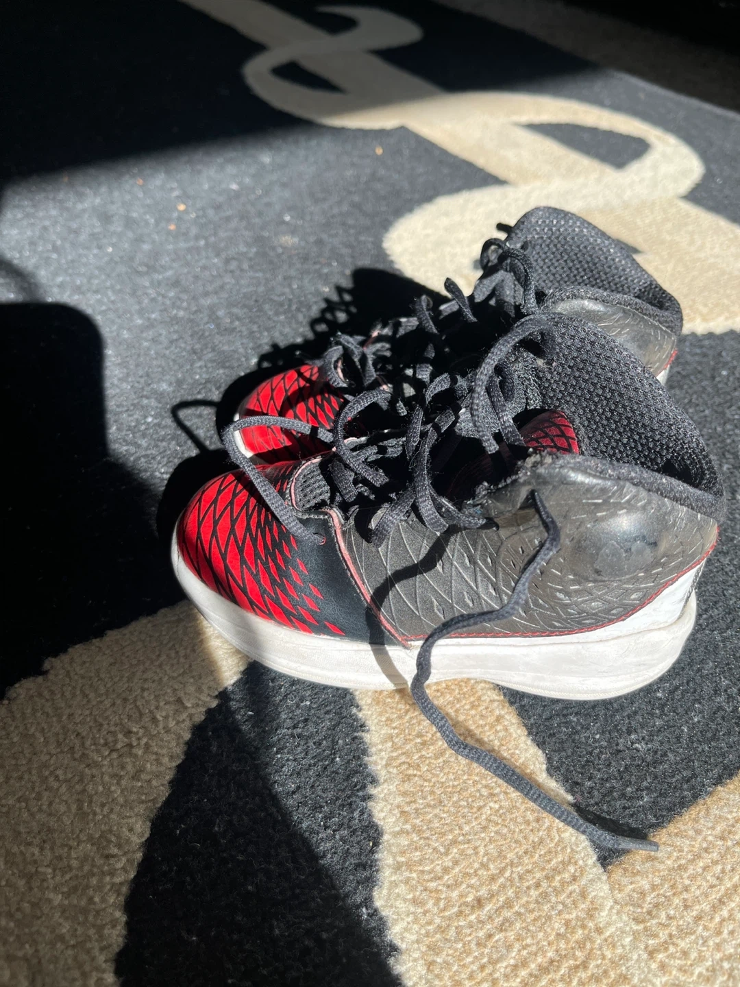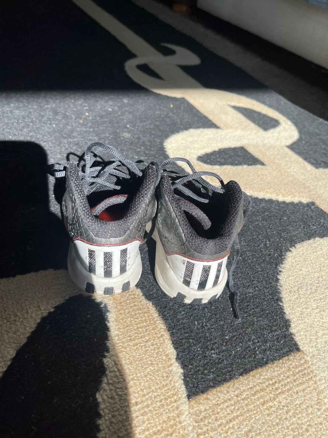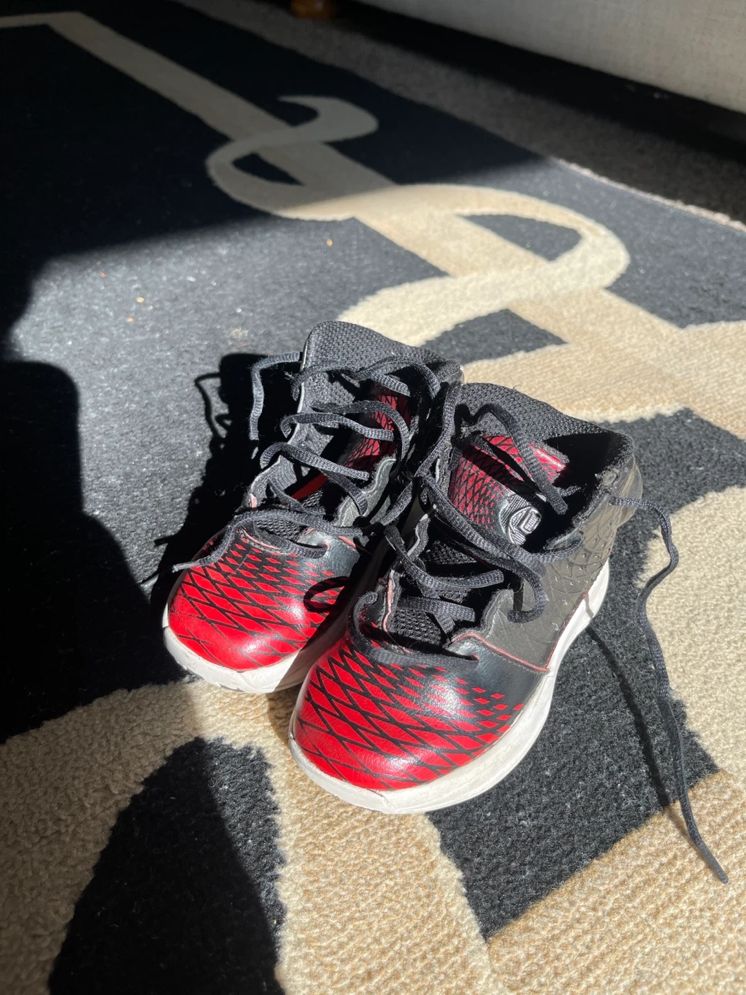Adidas kids' basketball shoes in black and red. Size 9K. These shoes offer good ankle support for active kids. They feature a durable rubber sole for traction on the court. These are great for kids who love playing basketball!