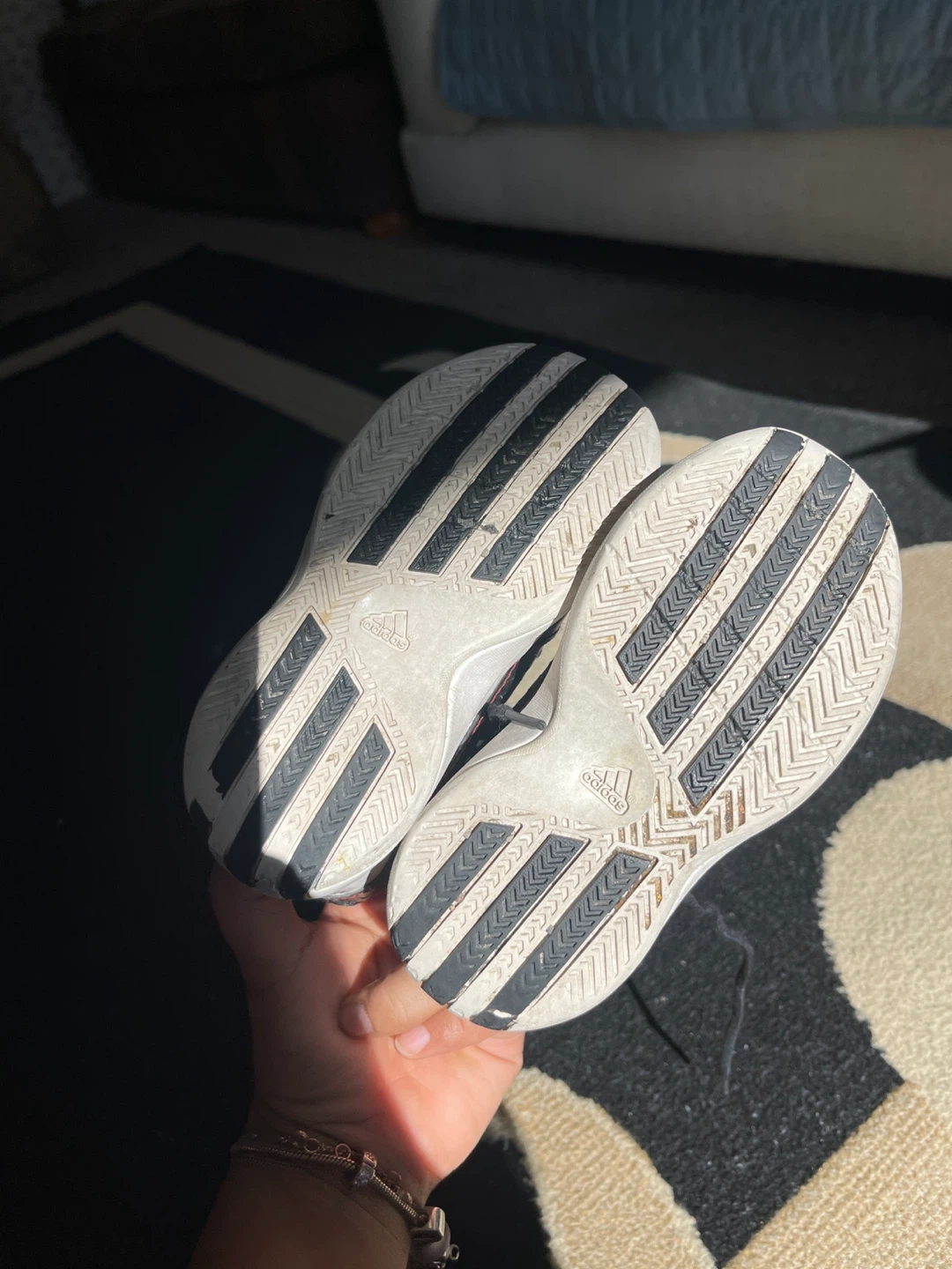 Adidas kids' basketball shoes in black and red. Size 9K. These shoes offer good ankle support for active kids. They feature a durable rubber sole for traction on the court. These are great for kids who love playing basketball!