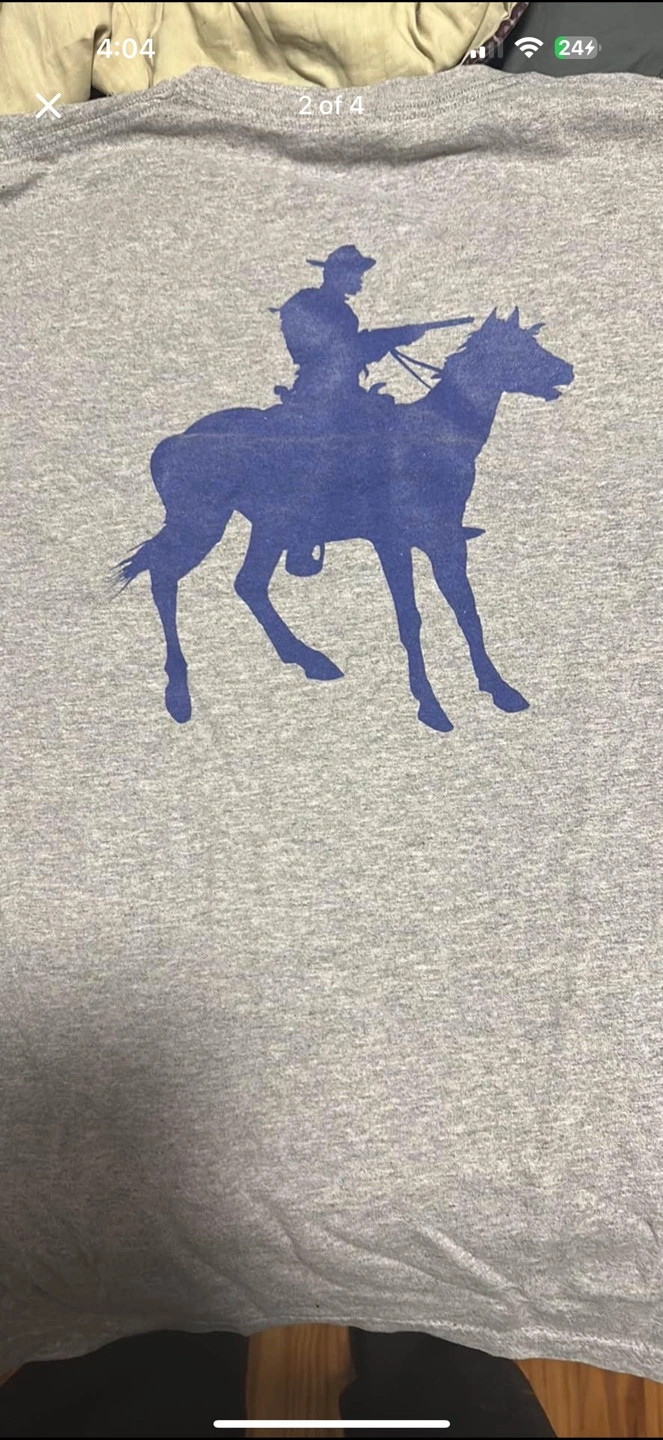 Grey T-Shirt with Marlin Firearms logo on the front and a cowboy on horseback on the back.