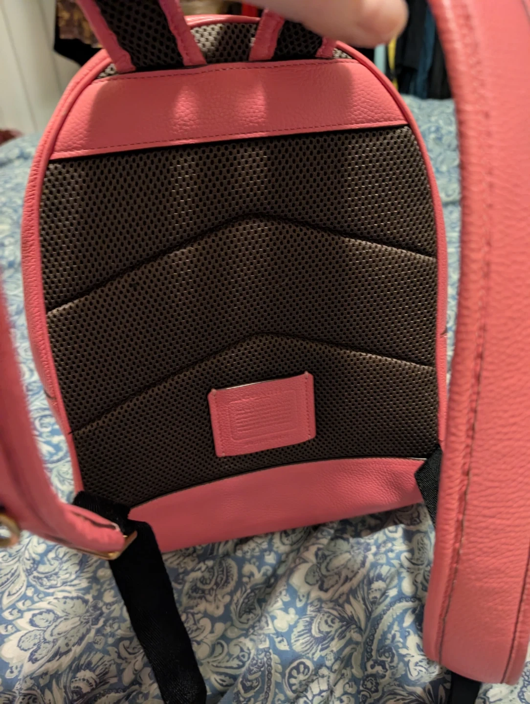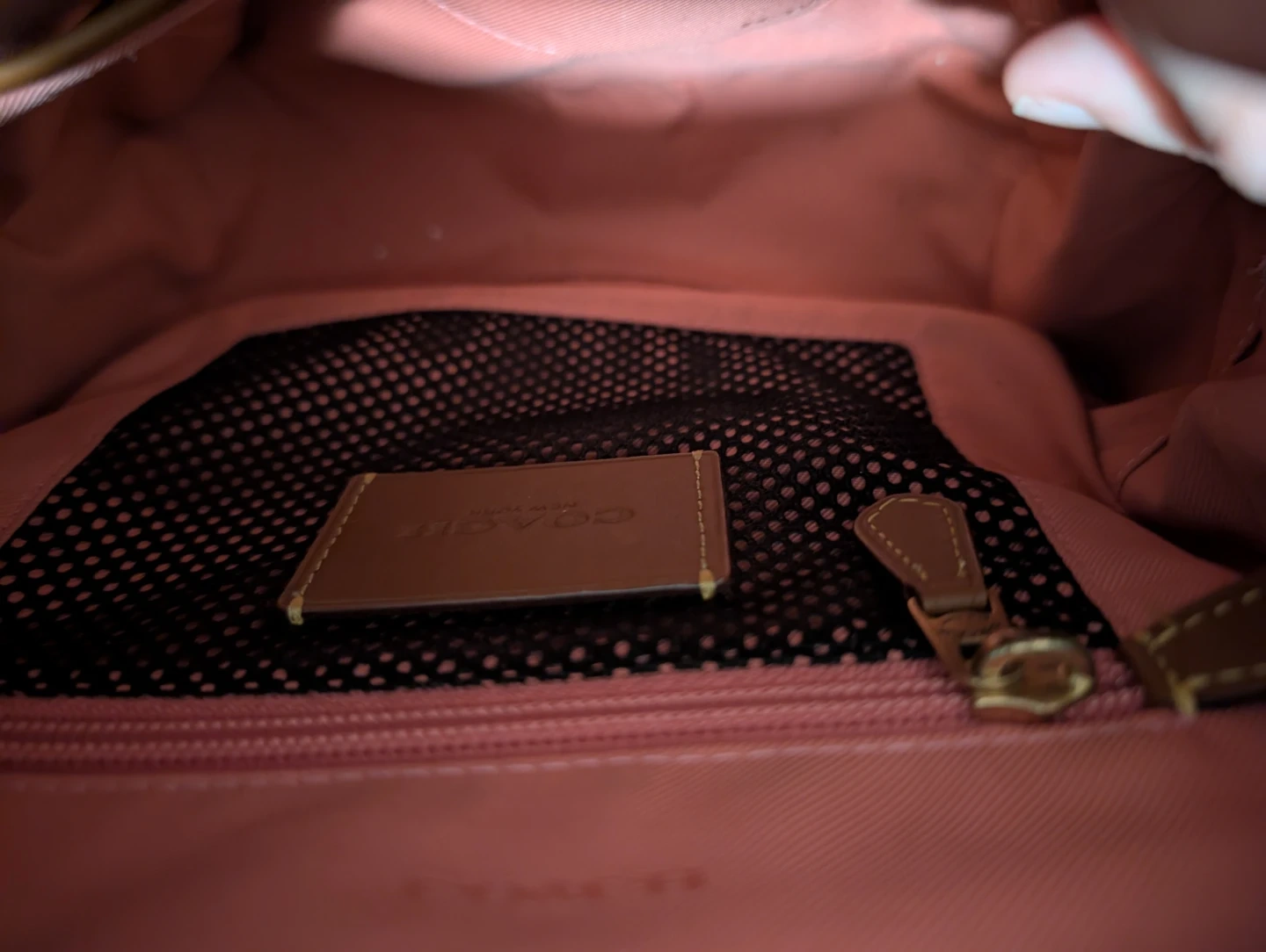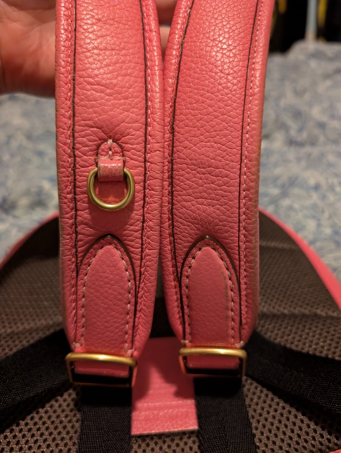 Adorable, authentic Coach backpack purse in a muted fuschia raspberry colour. In very good used condition, from Coach, not Coach outlet. Has a bit of colour transfer from a black leather jacket, which is not noticeable when wearing (see photos). I have kept it in great condition with regular cleaning and leather conditioning.