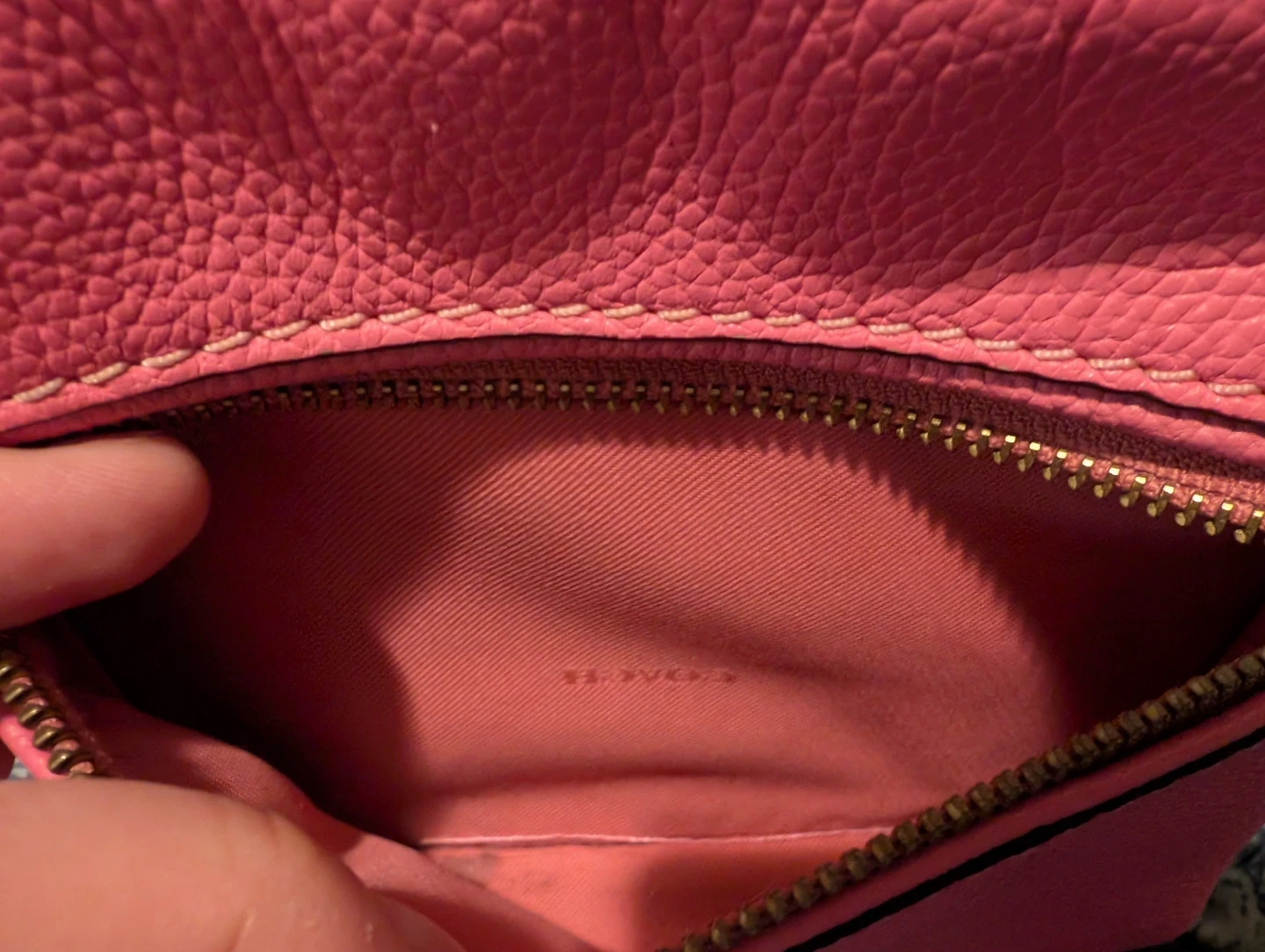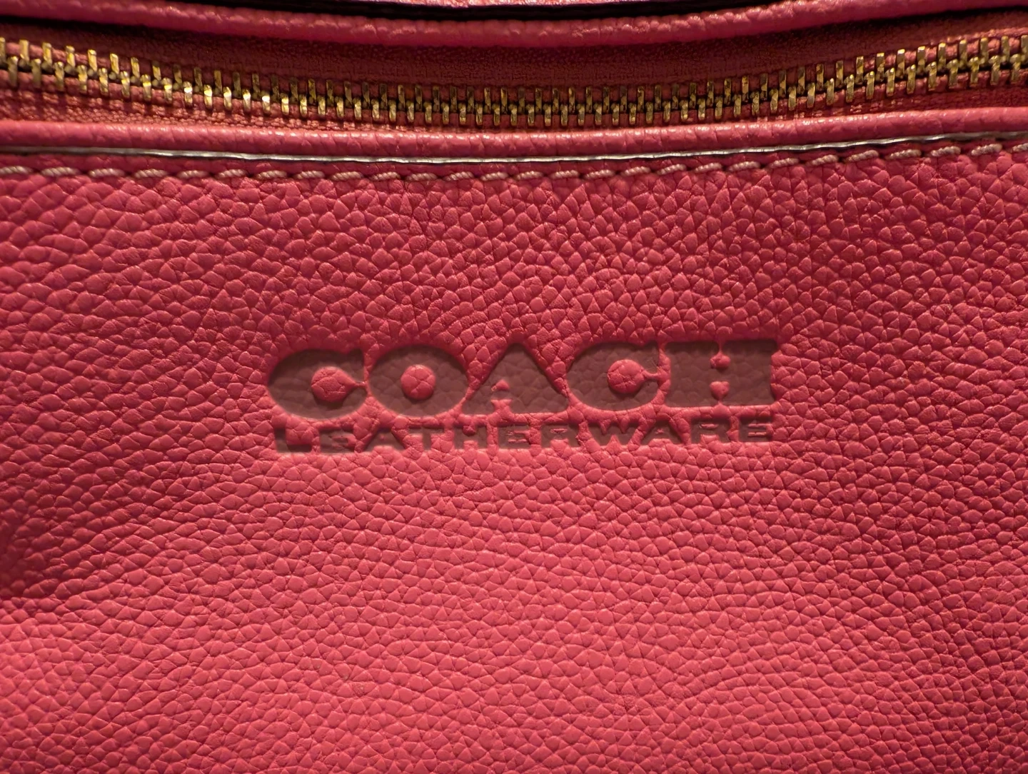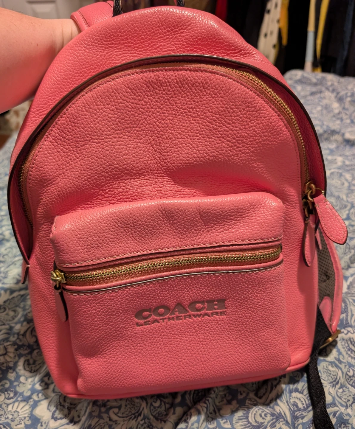 Adorable, authentic Coach backpack purse in a muted fuschia raspberry colour. In very good used condition, from Coach, not Coach outlet. Has a bit of colour transfer from a black leather jacket, which is not noticeable when wearing (see photos). I have kept it in great condition with regular cleaning and leather conditioning.