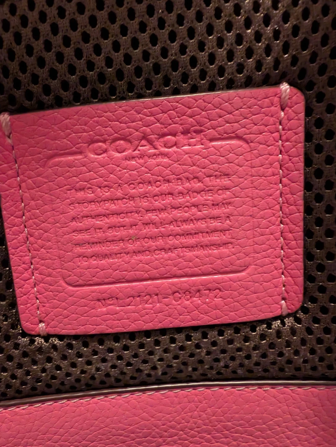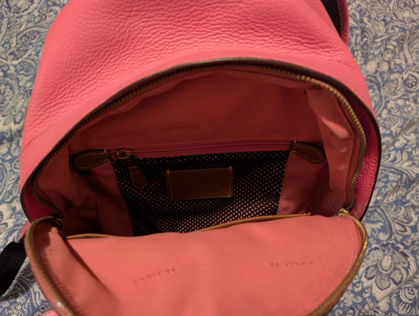 Adorable, authentic Coach backpack purse in a muted fuschia raspberry colour. In very good used condition, from Coach, not Coach outlet. Has a bit of colour transfer from a black leather jacket, which is not noticeable when wearing (see photos). I have kept it in great condition with regular cleaning and leather conditioning.