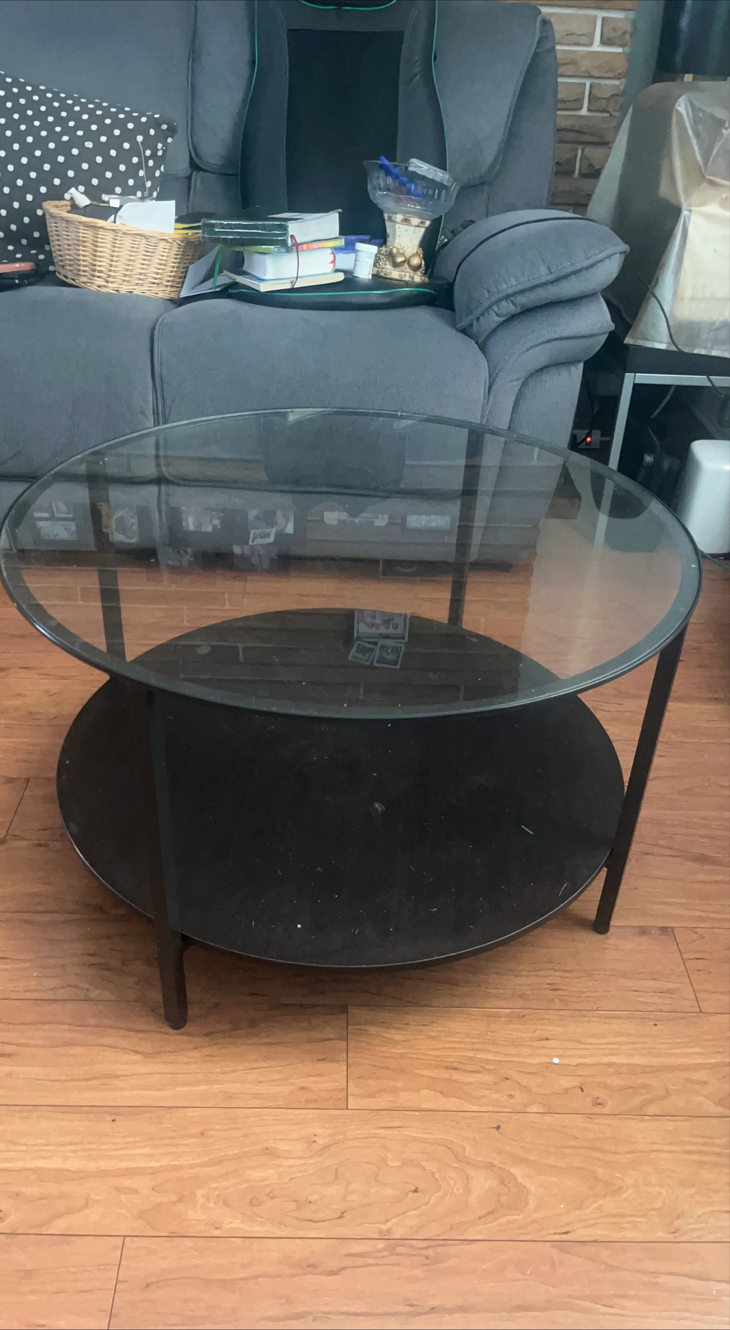 This coffee table features a clear glass top and a lower black shelf. It has a sleek, modern design that complements most living spaces. Great for holding drinks, books, or decor!