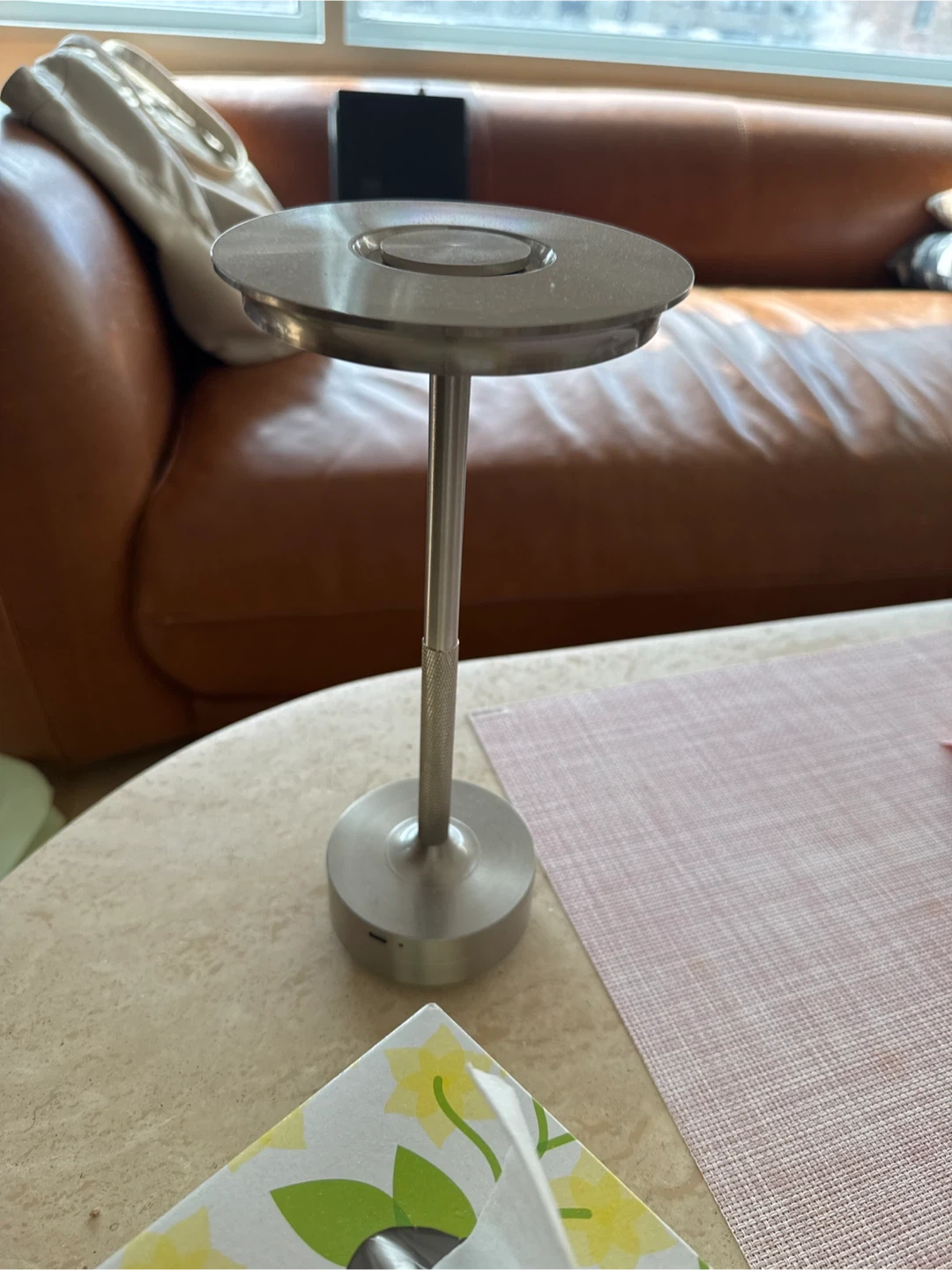 Here's a stylish silver table lamp that would look great in any room! It has a modern design and provides a nice ambient light. Great for a desk or nightstand