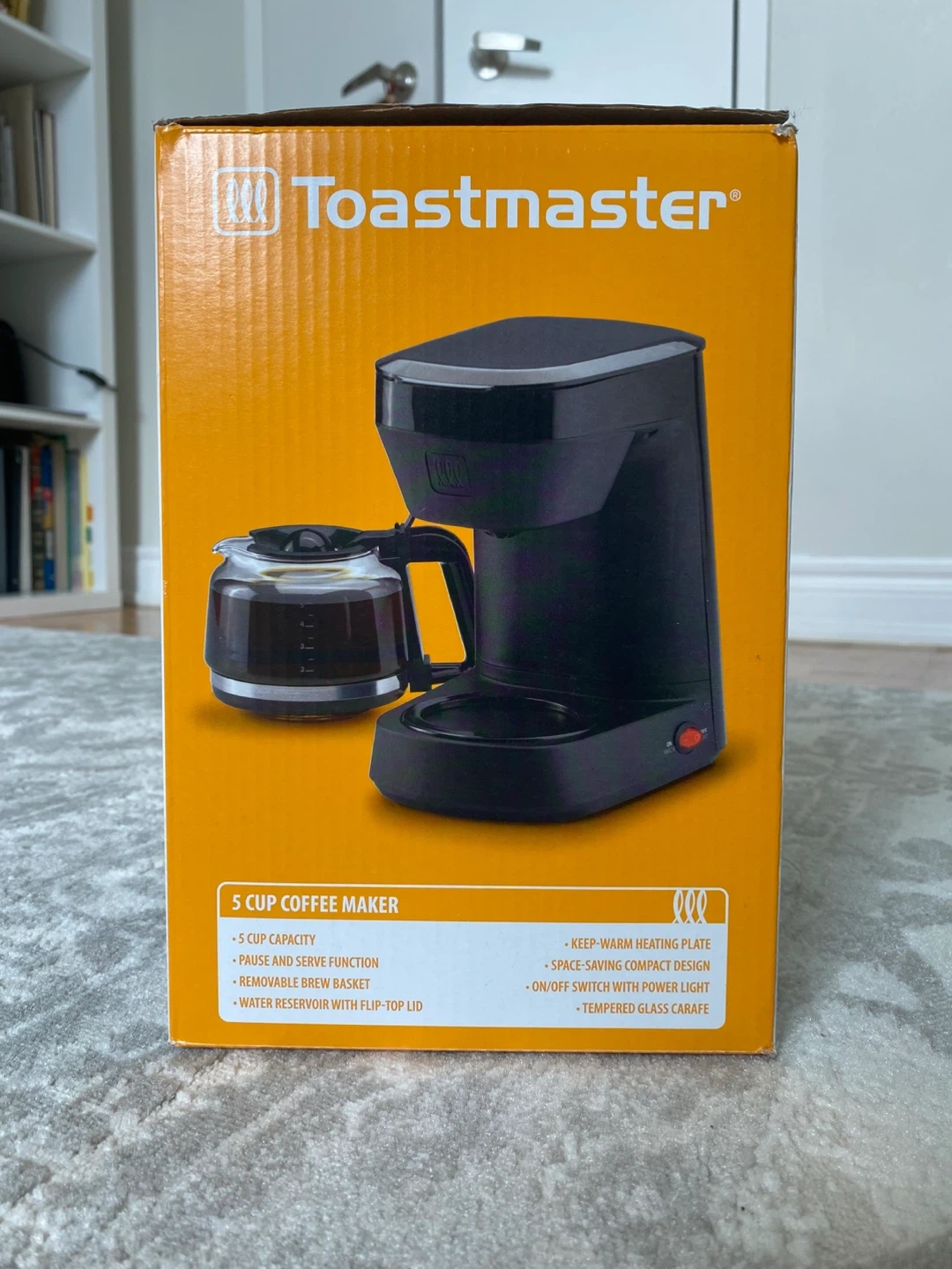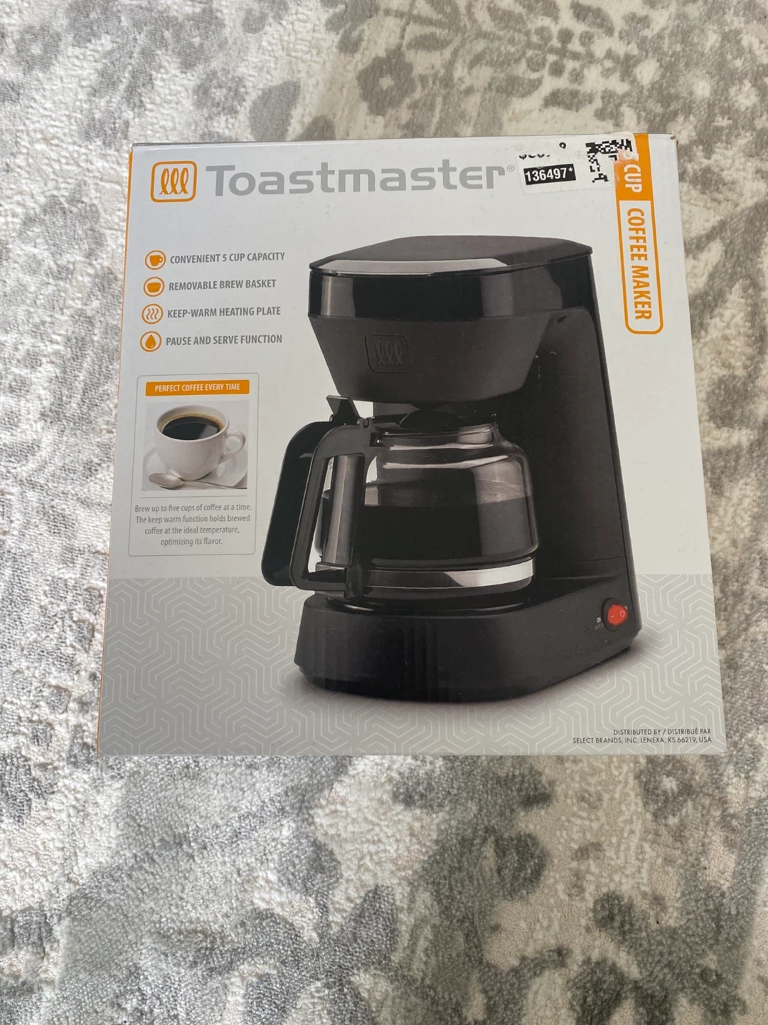 This Toastmaster coffee maker has a 5 cup capacity. It features a removable brew basket and a keep-warm heating plate. The pause and serve function allows you to grab a cup before the brewing cycle is complete. It's a compact design perfect for small spaces!