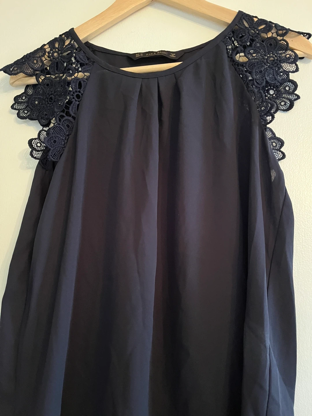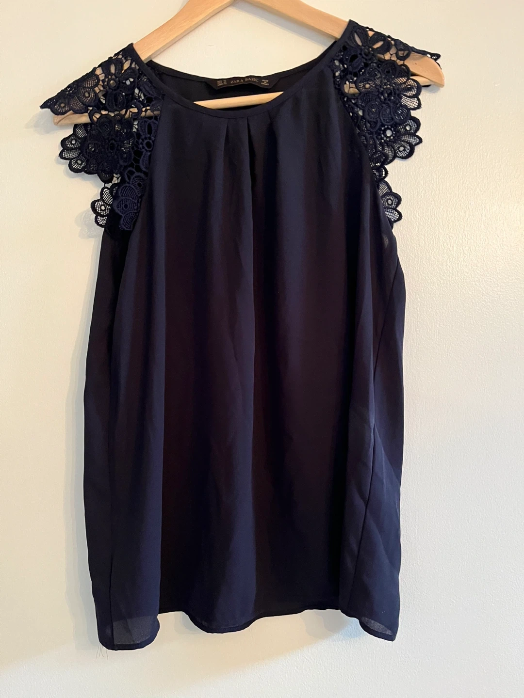 Navy blue sleeveless blouse from Zara Basic. It features delicate lace detailing on the shoulders. Material is lightweight and flowy.