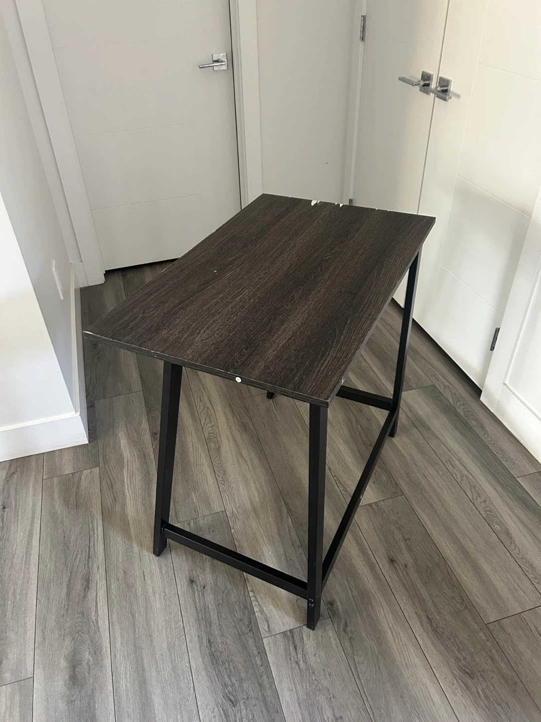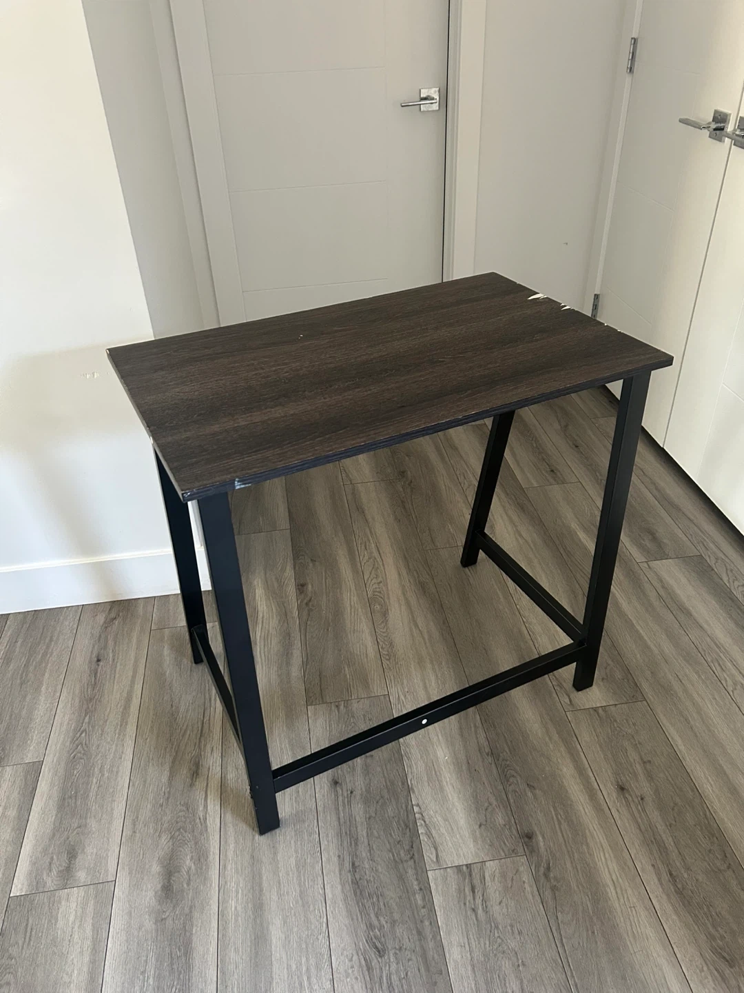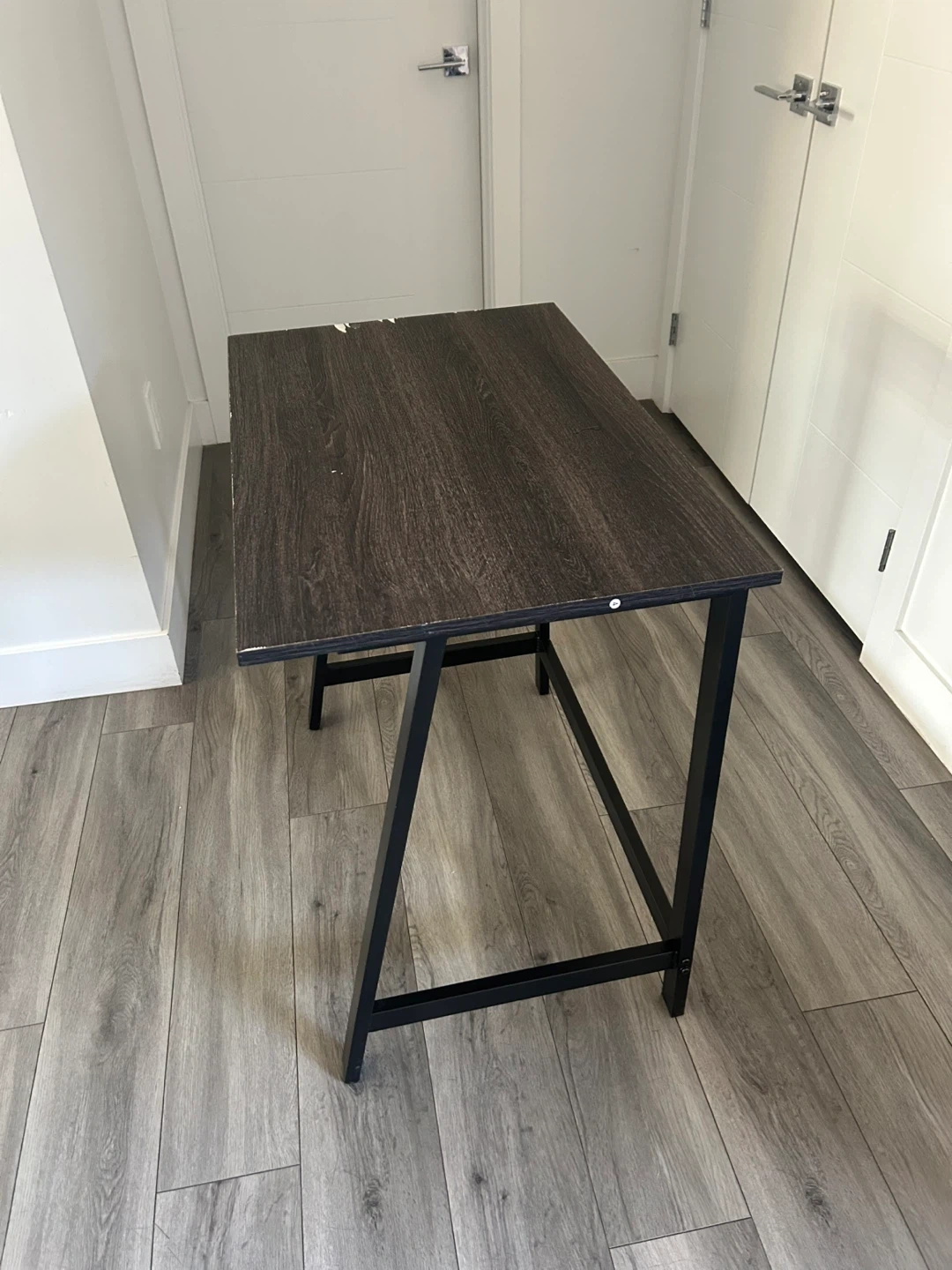 (*CHAIR IS NOT INCLUDED*) Dark Wood Desk with Black Metal Frame. Simple And Compact. In Good Condition Has Some Wear As Shown In The Pics.