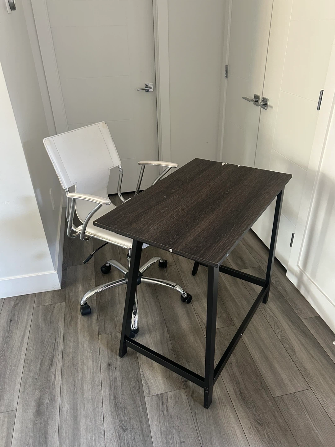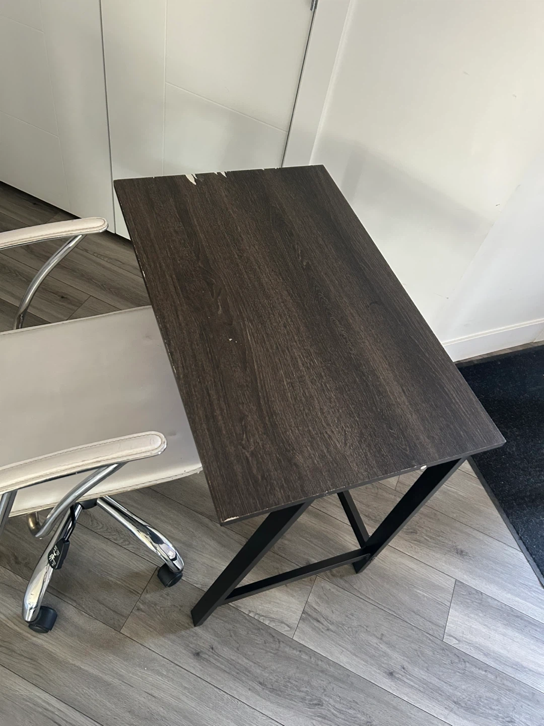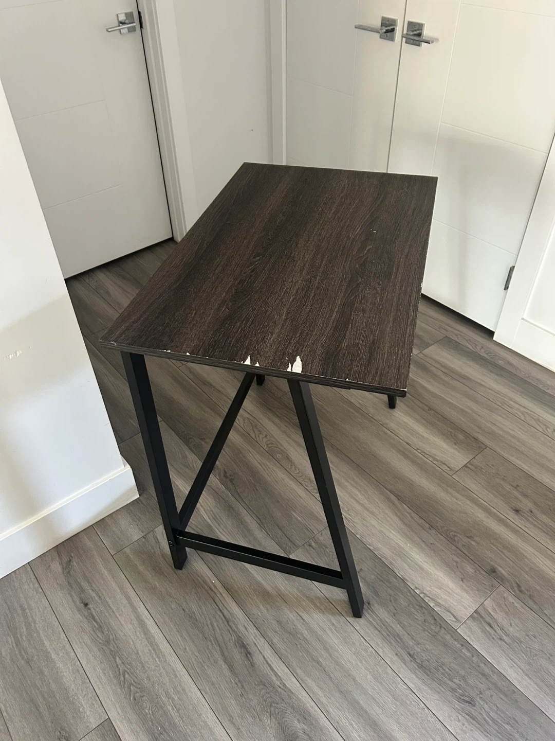 (*CHAIR IS NOT INCLUDED*) Dark Wood Desk with Black Metal Frame. Simple And Compact. In Good Condition Has Some Wear As Shown In The Pics.
