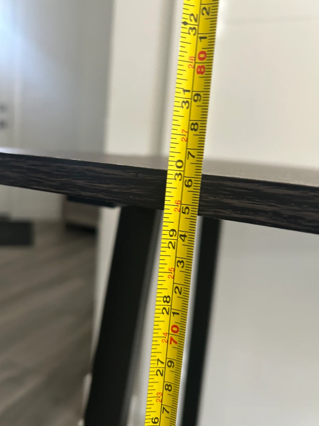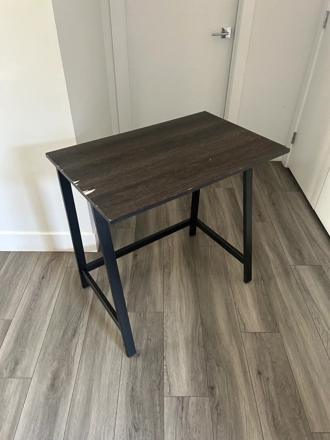 (*CHAIR IS NOT INCLUDED*) Dark Wood Desk with Black Metal Frame. Simple And Compact. In Good Condition Has Some Wear As Shown In The Pics.