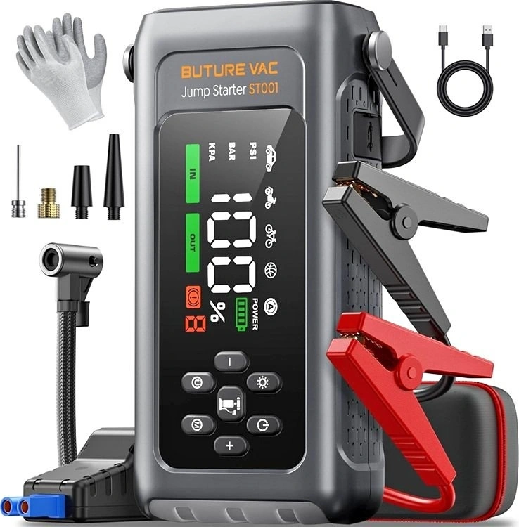 This is a versatile 9-in-1 jump starter pack for your car. It functions as a jump starter for dead batteries, a tire inflator with a 150PSI air compressor and smart display, a portable power bank, and includes a bright flashlight with SOS and strobe functions for emergencies. It can start most gas engines up to 9L diesel and works in temperatures from -20℃ to 60℃. The compressor inflates a tire quickly and has preset modes. It also comes with insulated gloves for safety. Great for everyday use and unexpected roadside issues.