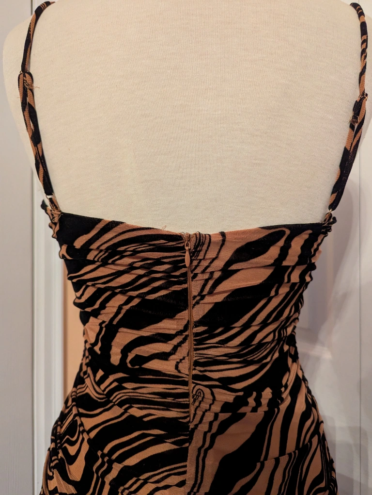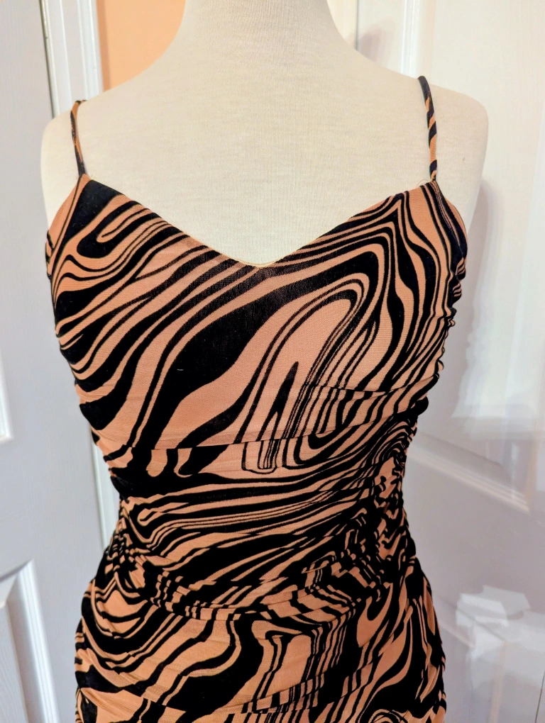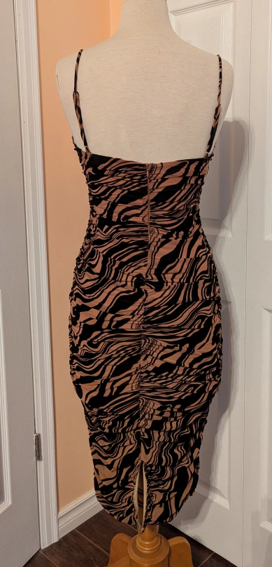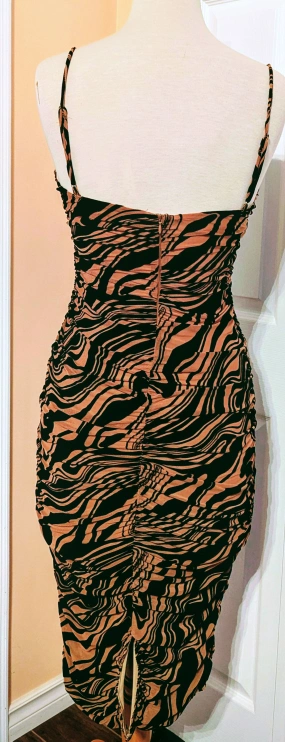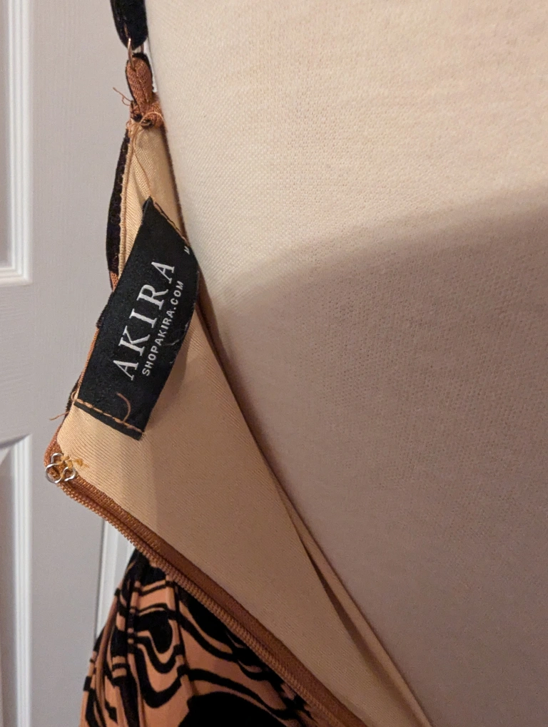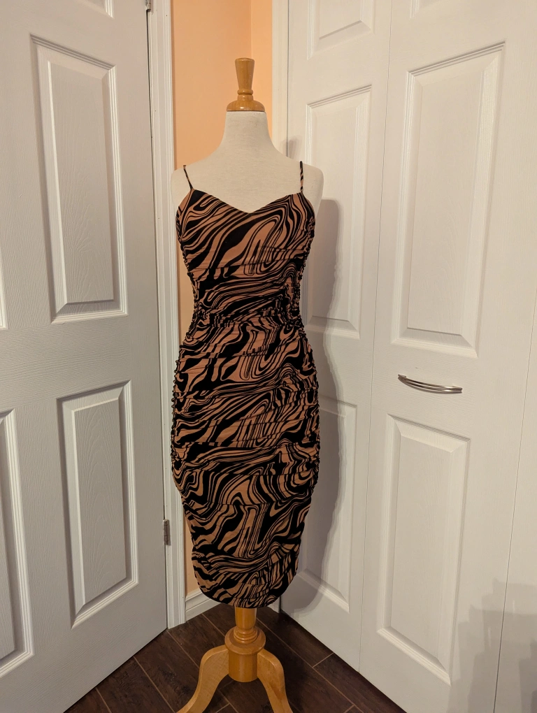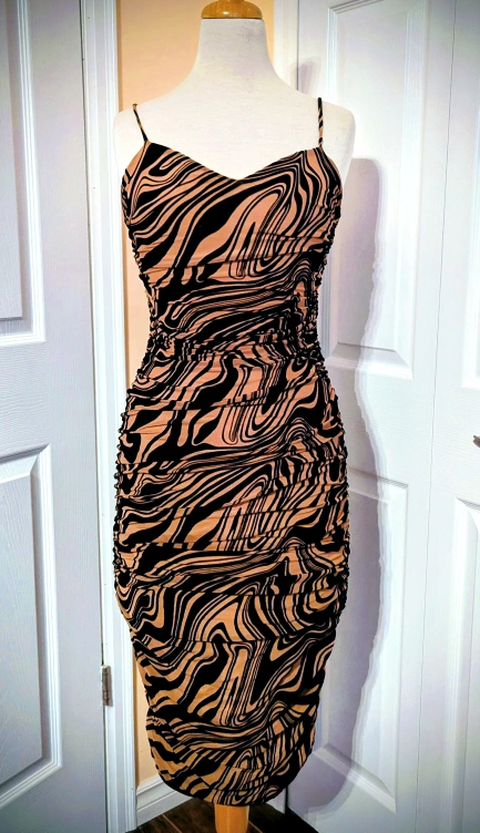 Here's a stylish Akira dress in a striking black and tan swirl pattern. It's a size medium and features a flattering silhouette. Perfect for a night out or a special occasion!