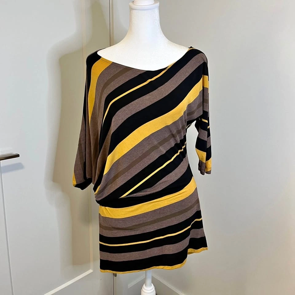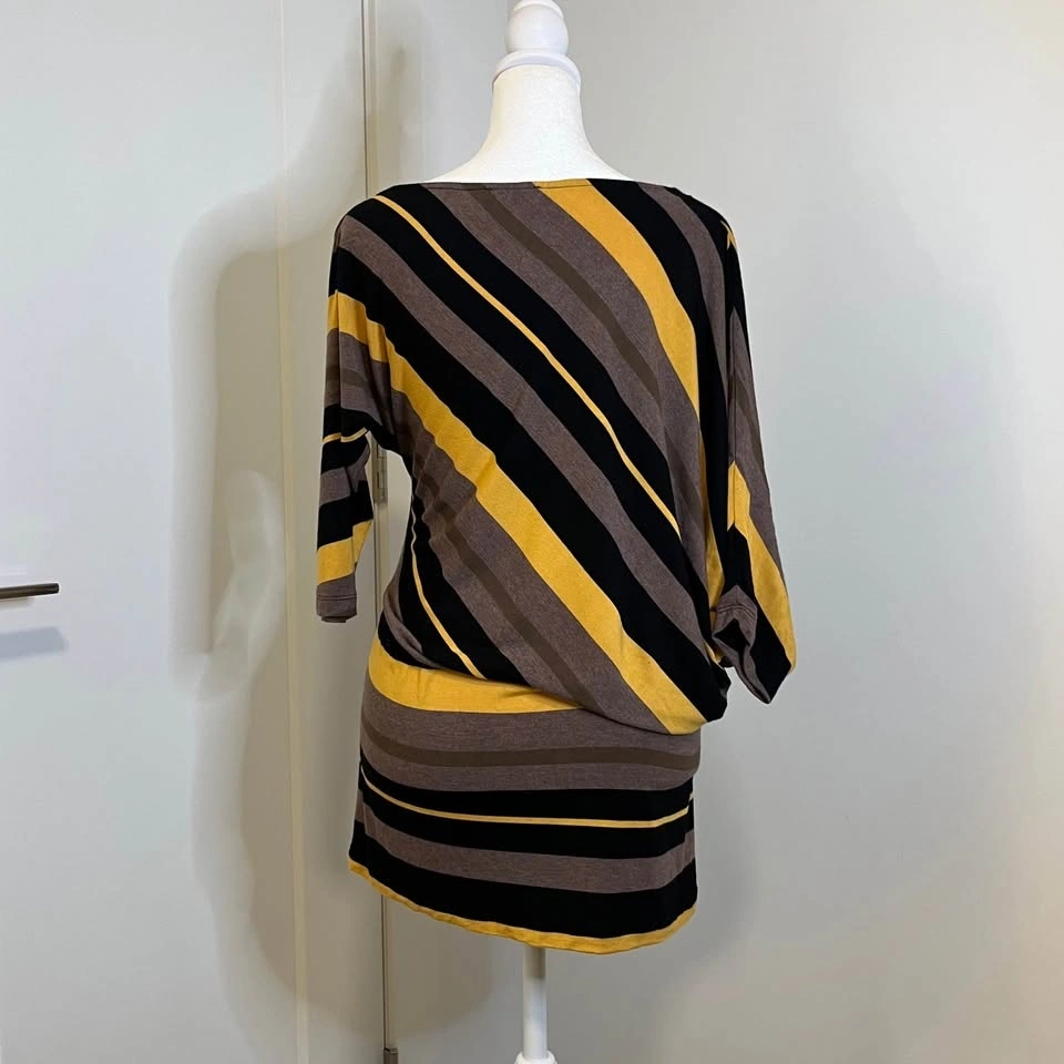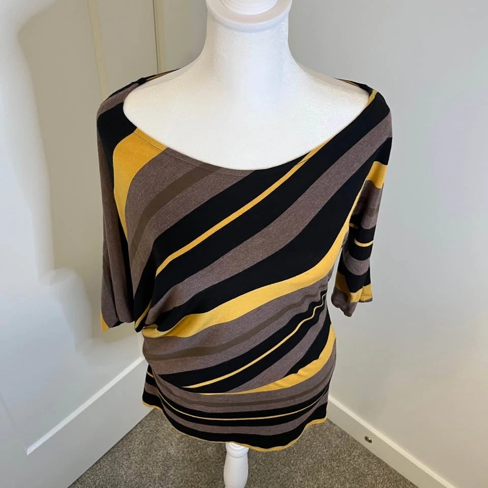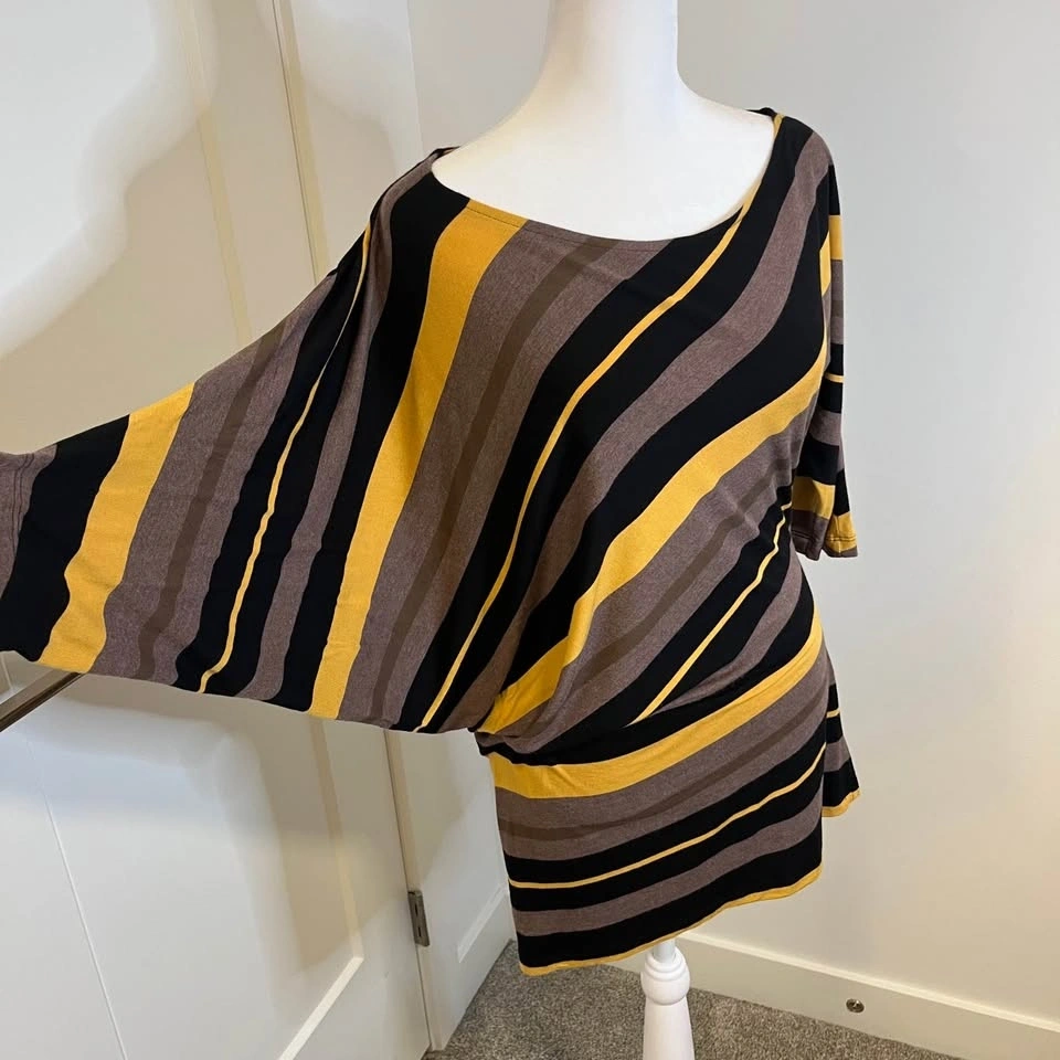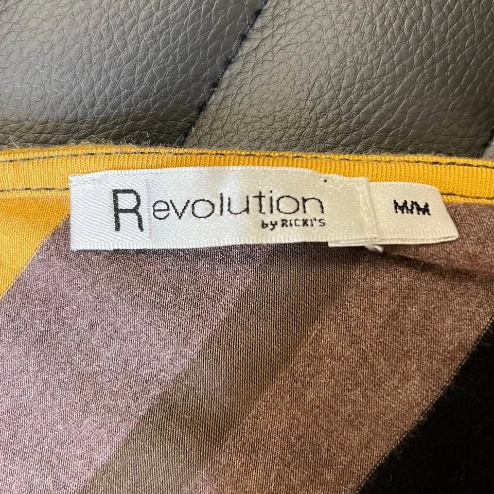 Asymmetrical multi-coloured stripped women’s shirt by Revolution from Ricki’s. Features black, mauve, yellow, and tan colours. Unique asymmetrical design.