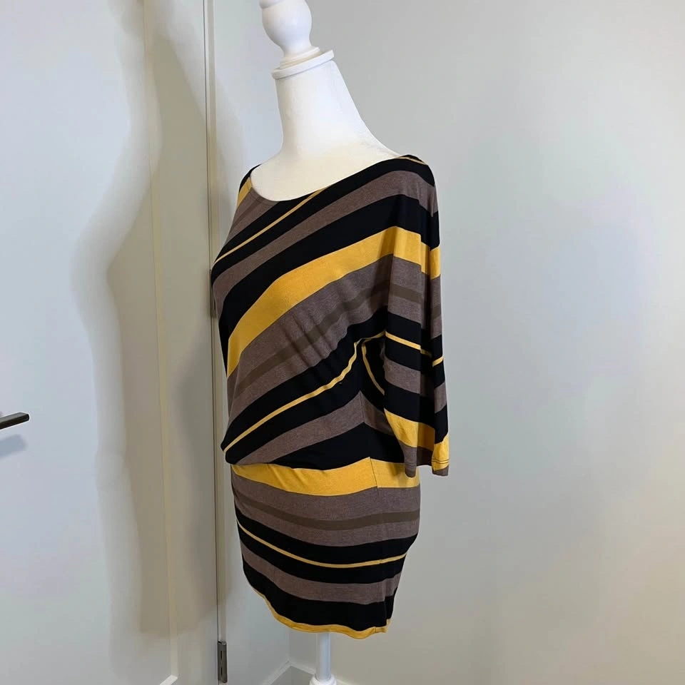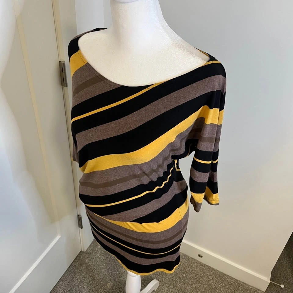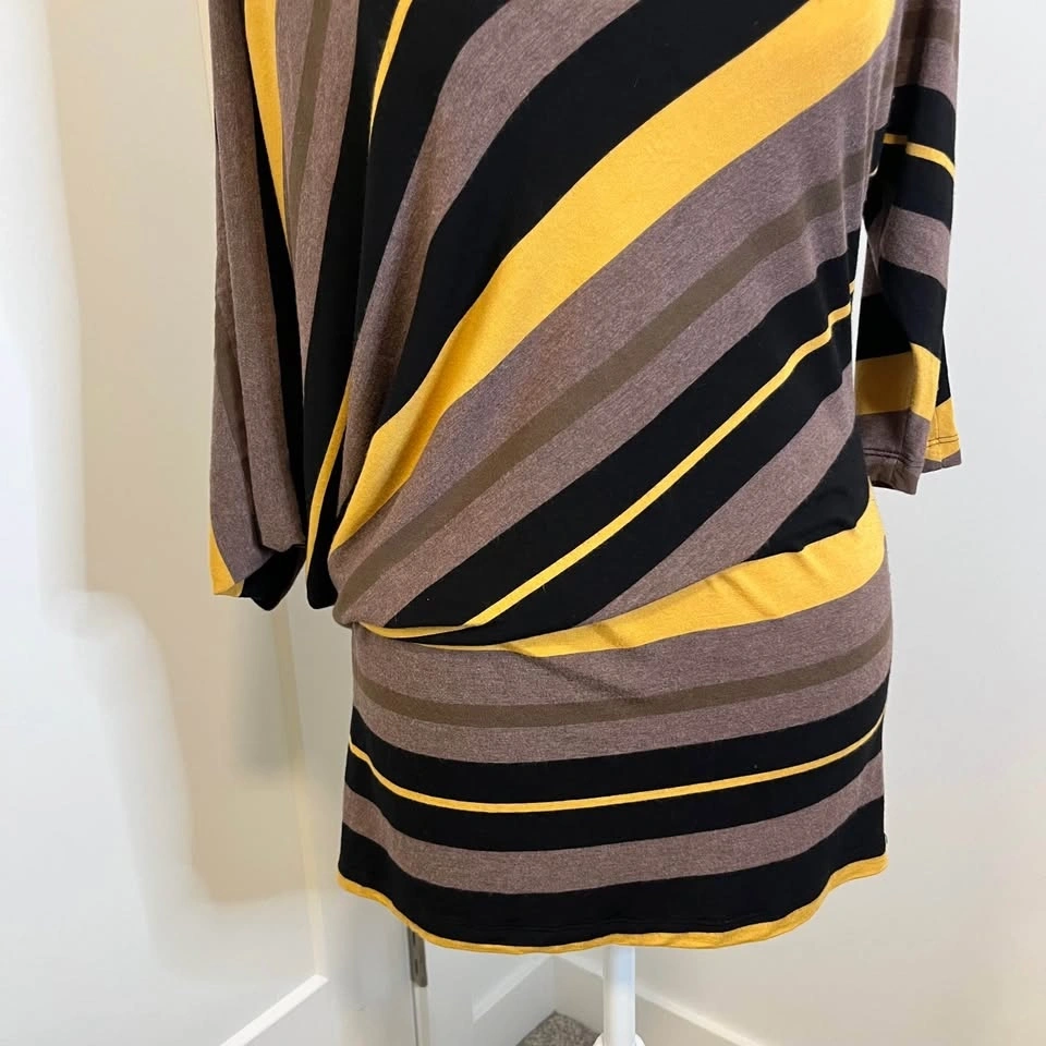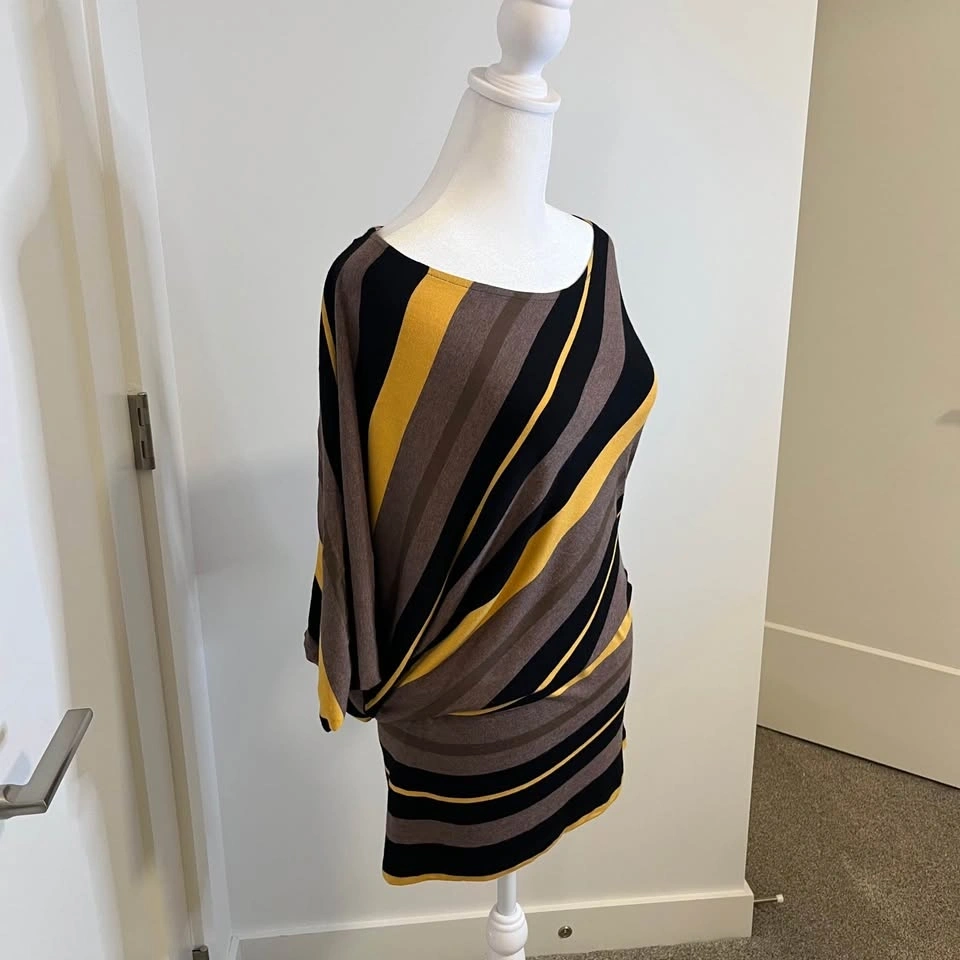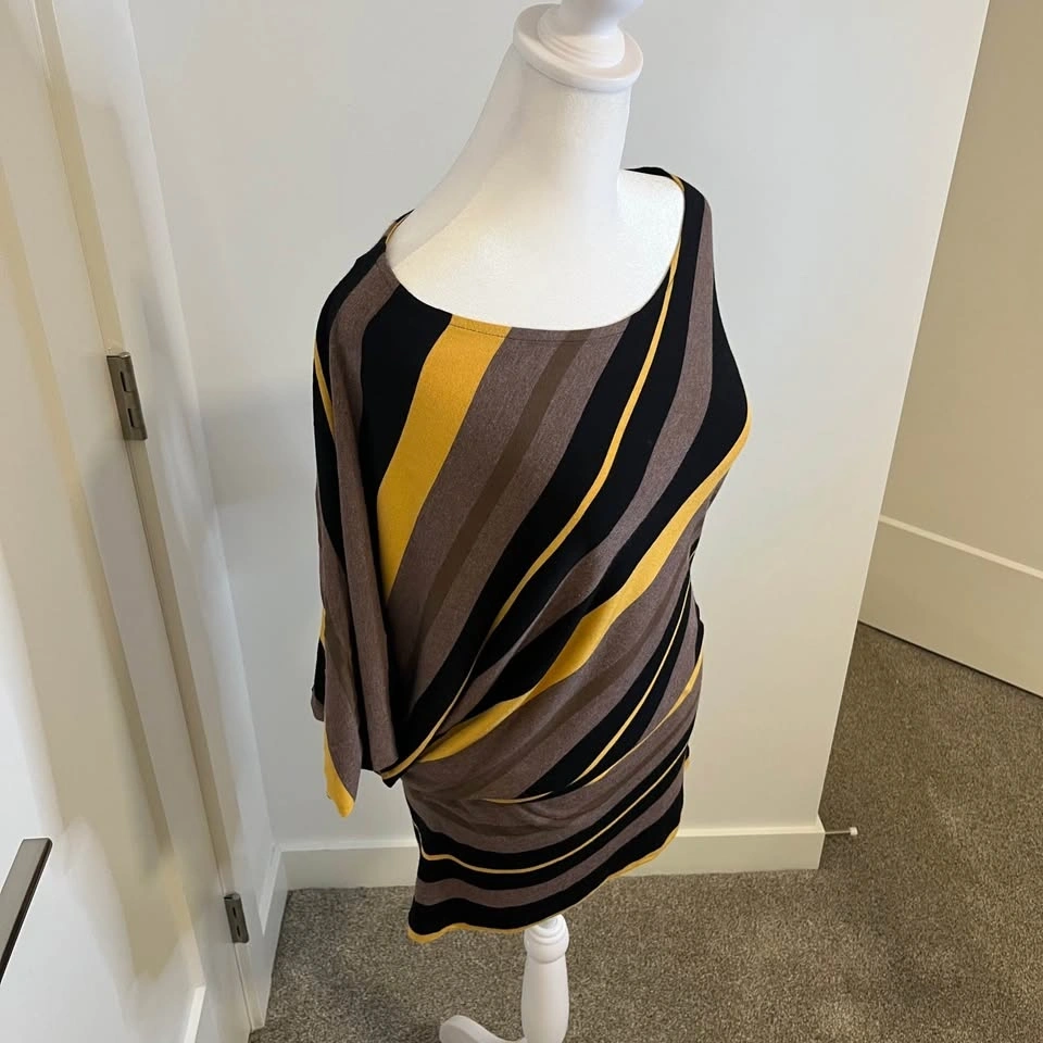 Asymmetrical multi-coloured stripped women’s shirt by Revolution from Ricki’s. Features black, mauve, yellow, and tan colours. Unique asymmetrical design.