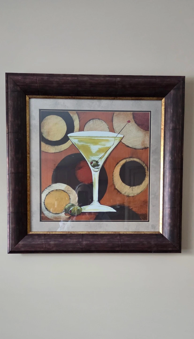 This framed print features a stylish martini glass with olives, set against a backdrop of more olives. The artwork is housed in a dark, textured frame with a subtle gold accent. It's a great piece to add a touch of class to any room!