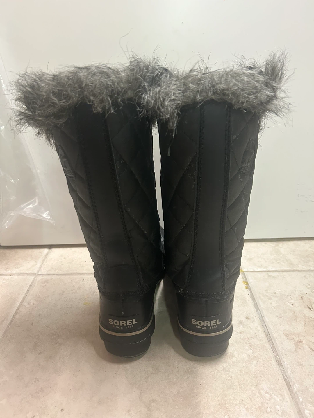 Cozy Sorel winter boots in black, featuring faux fur trim. These boots are designed for cold weather. Perfect for keeping your feet warm on chilly days!