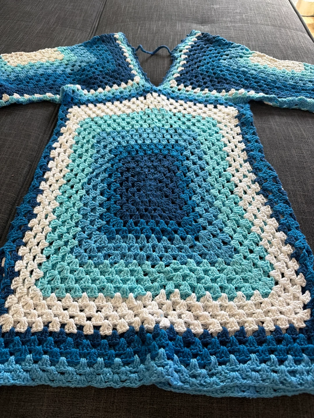 This handmade crochet tunic cover-up features a granny square design in shades of blue and white. It has wide sleeves and a v-neckline with a tie. This piece is great for layering over swimwear.