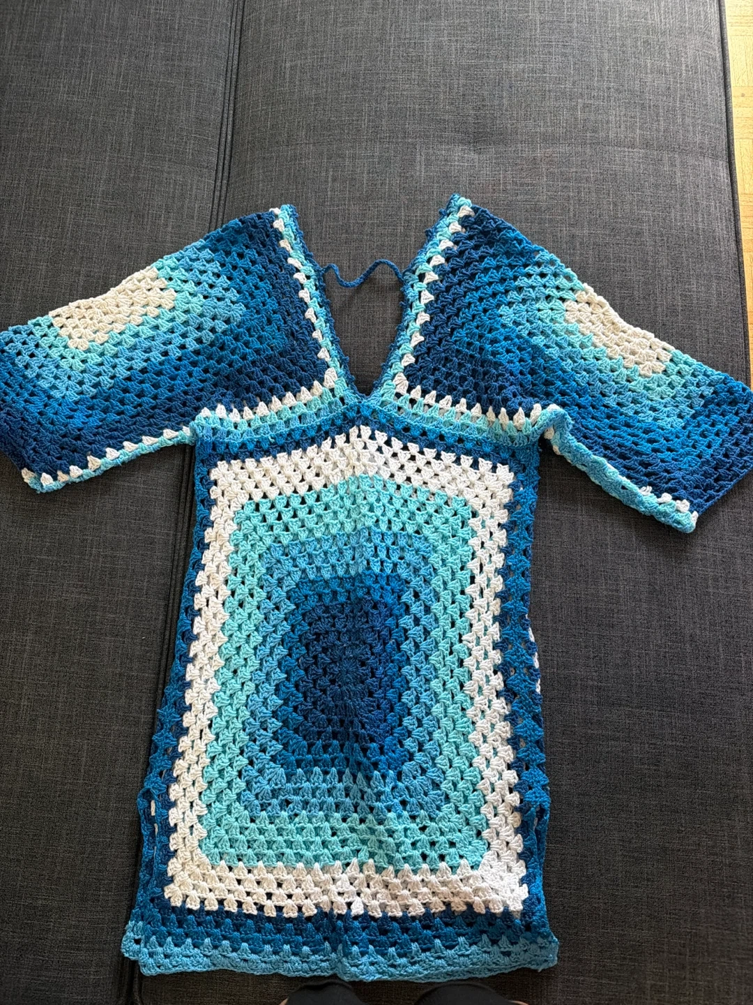 This handmade crochet tunic cover-up features a granny square design in shades of blue and white. It has wide sleeves and a v-neckline with a tie. This piece is great for layering over swimwear.