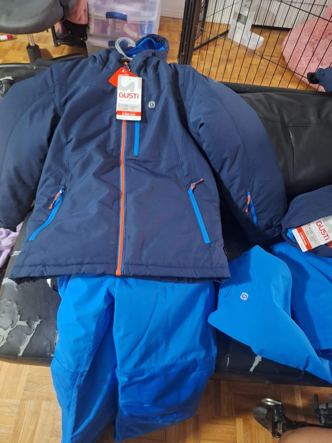 2 jacket Gusti kids ski jacket and snow pants set in navy blue and bright blue. Features water-resistant fabric with 8,000 mm rating. This set is perfect for staying warm and dry on the slopes. Includes jacket and pants.
